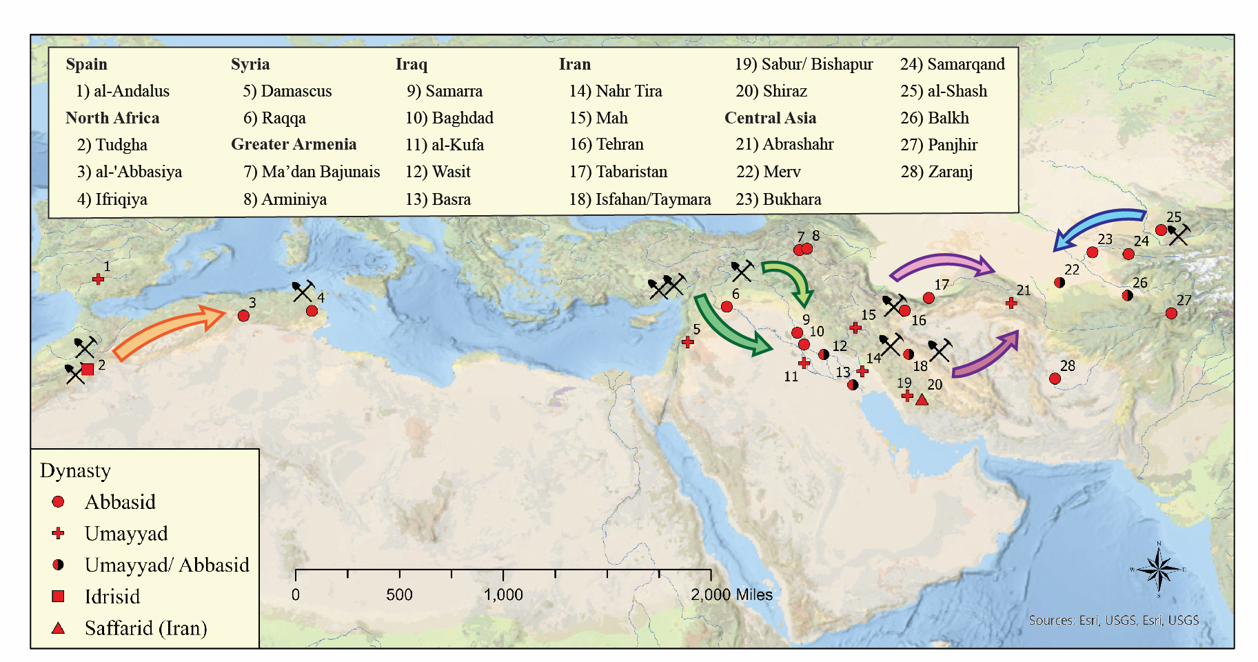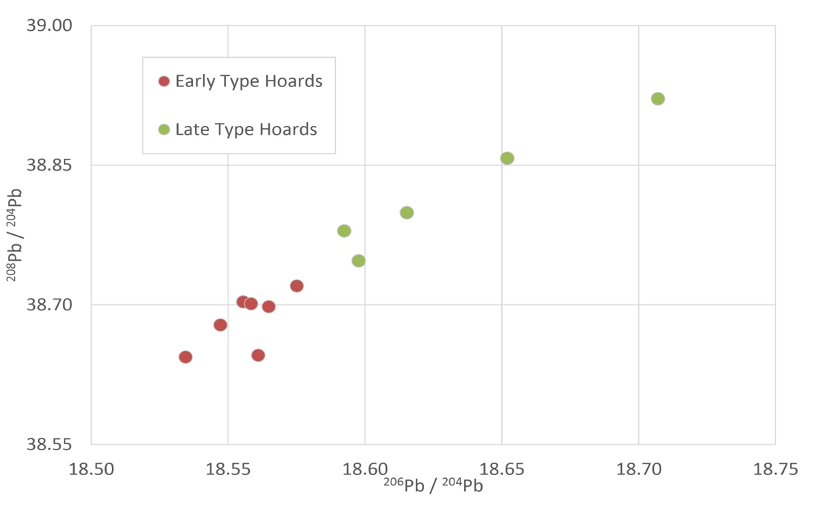 Analysis of dirhams revealed they their silver derived from dry silver ores - not galena (publication 3), opening up the question of silver sources. From our analysis, we identified sources of mining across the Caliphate (publication 9) (Fig. 3). This also allowed us to develop an isotope fingerprint of dirham silver reaching Scandinavia (publication 5). We showed that there was a chemical difference between stocks of silver entering Scandinavia before and after 850 (Fig. 4). The pre-850 signature was especially strong in the analysed silver, showing that significant quantities of dirhams must have reached Scandinavia at this early date, but were melted down. Analysing Viking silver objects, we found a significant pre-850 Islamic component in all regions apart from the Irish Sea and on the Continent. The Vikings didn't just extract local silver, they also brought it with them. Western silver was visible, but not in the volume expected, suggesting that the impact of the Viking raids may have been exaggerated in written accounts. The Islamic connection was strong even early on in the ninth century, before dirhams are recorded in significant number.