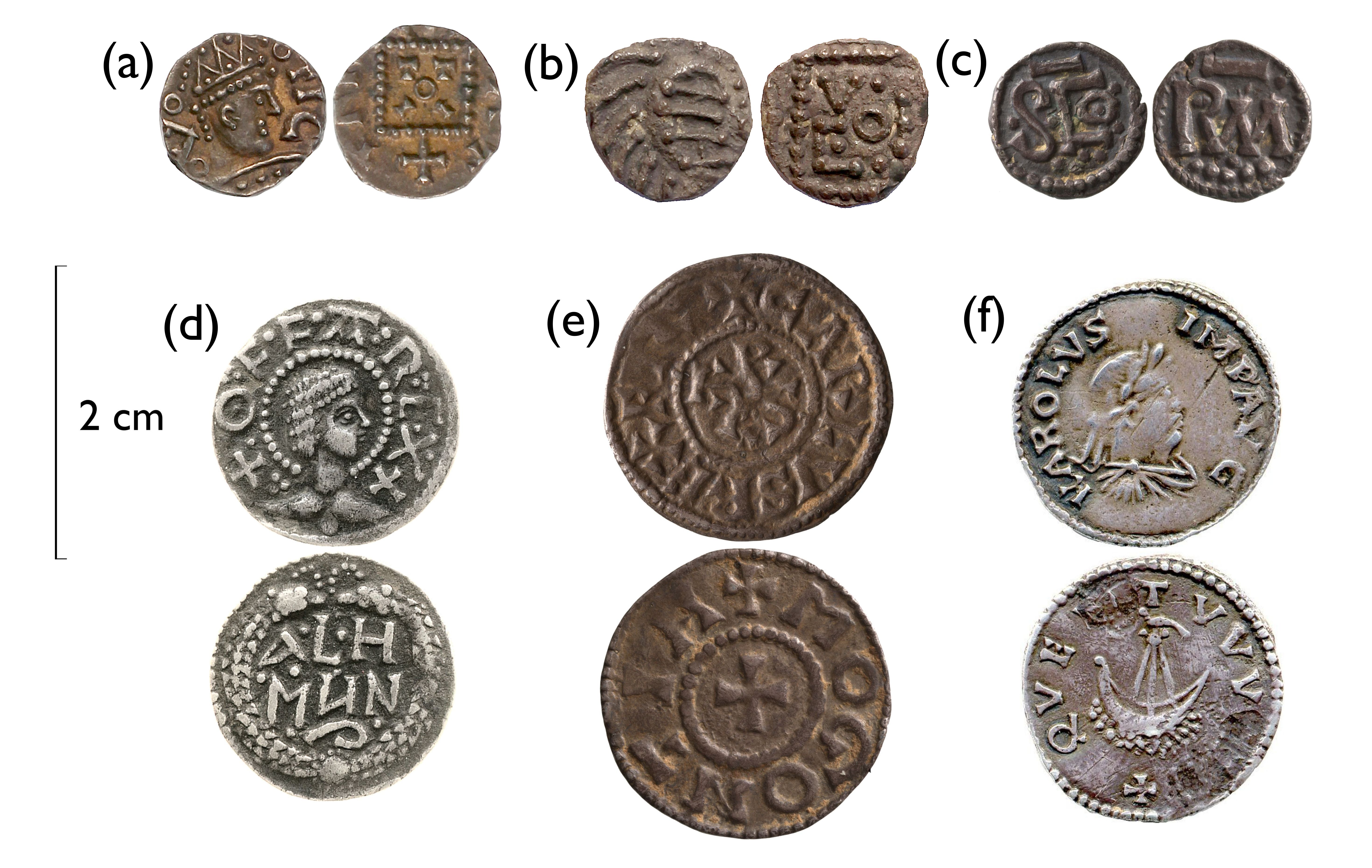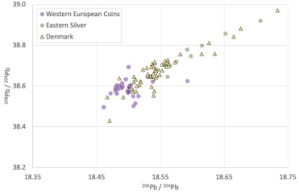 Thanks to the flexibility of the ERC grant, we have been able to apply our methods and approaches to other, early medieval material. Our analysis of lead, undertaken initially to evaluation the evidence for cupellation, revealed new insights into lead mining. For instance, we found that lead was mined in the North Pennines in the Viking Age, and that this lead was shipped across the North Sea to Scandinavia (publication no. 11). We also looked at some earlier material: the earliest coins minted in post-Roman England and France, from the end of the seventh century. This work revealed, astonishingly, that the coins were initially made of Byzantine silver that was stored as plate in England (Fig. 6). In other words, the silver was present in England and a decision was made to liquidate it to turn it into coinage around c. 680. After that, silver from France was used to produce silver coins on both sides of the North Sea (publication no. 10). Investigating Scandinavia's eastern connection also encouraged us to look at metals from the early Iron Age site of Helgo on Lake Malaren, Sweden, a precursor to the famous Viking town of Birka. In analysing brass, copper and lead, we found evidence that brass was imported from the Byzantine Empire, as early as the fifth/ sixth century (publication no. 12).