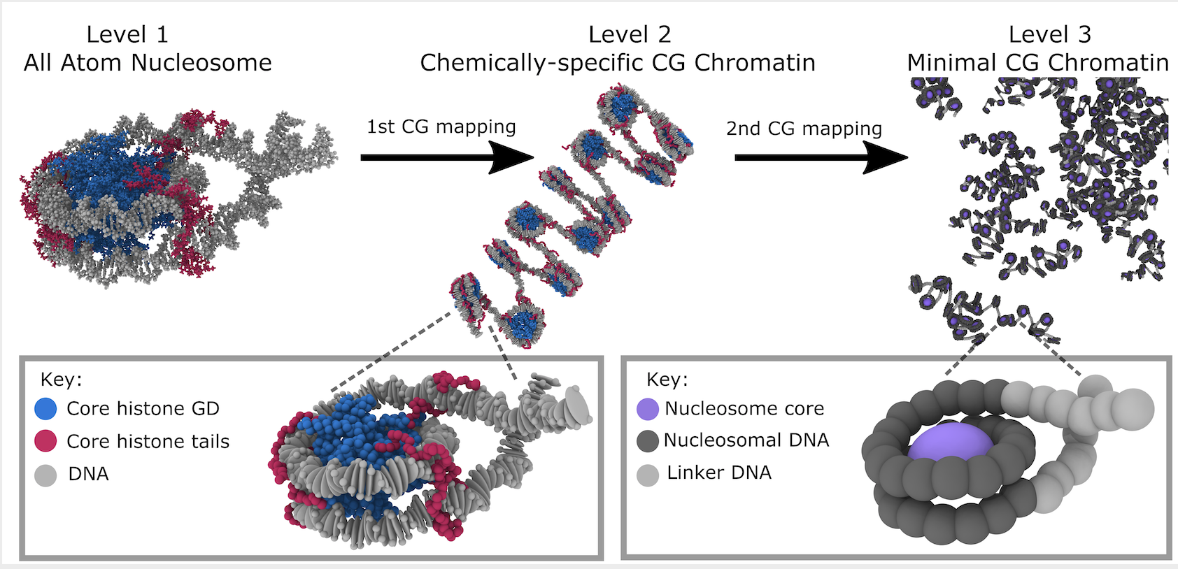 simulation study that resolves nucleosome organization inside structurally different Kb-scale domains, while accounting with atomistic resolution for the combination of epigenetic marks, architectural proteins, and nucleosome remodelling activity that distinguishes each domain. InsideChromatin will integrate atomistic simulations with two levels of coarse-graining and experimental data for validation to bridge nucleosome organization to physical properties in Mb-scale domains. InsideChromatin aims to bring us closer to the ‘holy grail’ of deciphering the connection between genome characteristics, structure, and function.
