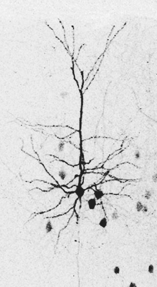 Dendritic spines and inhibitory synapses along cortical pyramidal neuron