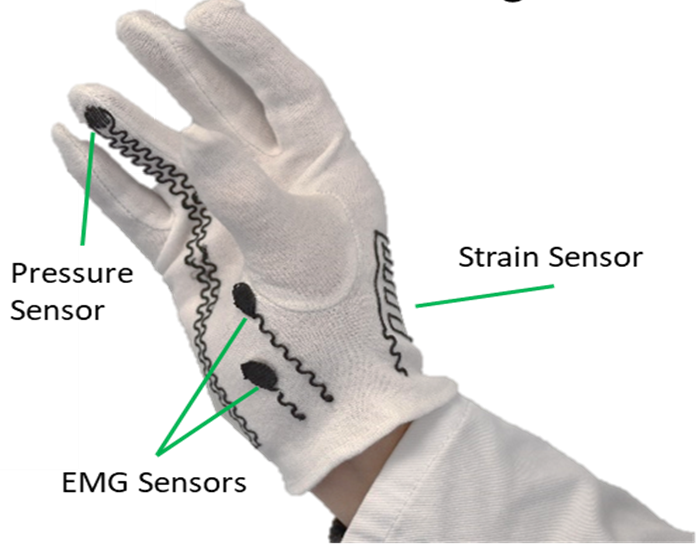 Besides implants and cell culture, we realised printed stretchable electronics can be applied in wearable sensor devices. We used cotton gloves onto which we directly printed stretch, pressure and electromyography sensors. The sensor gloves are customisable, inexpensive and simple to fabricate (Fig. 5) (11). We have considered them for use in diagnostics or monitoring of progressive neurological conditions (ongoing collaboration with a clinician).