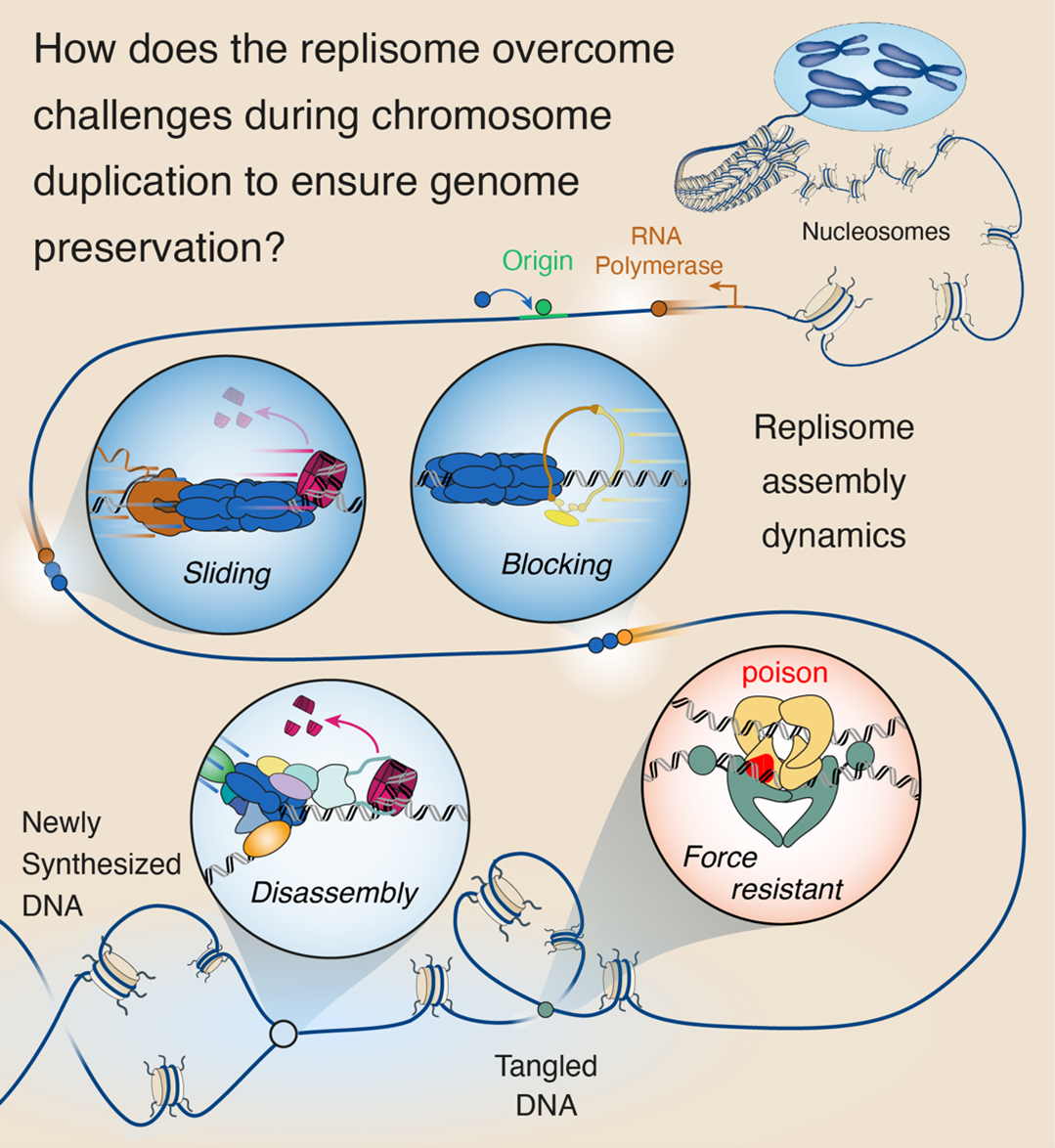 To overcome the limitations of past approaches, we developed imaging techniques with high resolution in time and space. These methods allowed us to watch machines at the scale of a few billions of a meter and few thousands of a second. Our specific aims were to understand how the replisome, the machine that copies DNA, overcomes obstacles on chromosomes including knots and tangles in DNA, nucleosomes—the basic building blocks of chromosomes—and other machineries. During our research, we unexpectedly discovered that the replisome is more dynamic than previously believed. Moreover, we found that these dynamics provide robustness. When an unexpected challenge occurs, a dynamic response allows for recovery and avoids chromosome damage. Taken together, our observations call for a new way of thinking about replisome operation that considers multiple parallel molecular pathways.