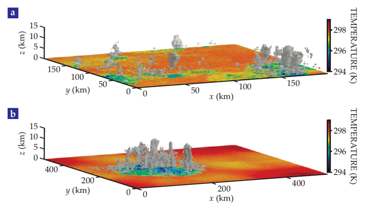 We also investigated the physical processes that lead to the largest cloud systems in realistic global high-resolution simulations. Cloud cover plays a key role in cloud radiative feedback, with implications for climate sensitivity. CLUSTER identified the internal feedbacks that lead to extensive cloud cover.