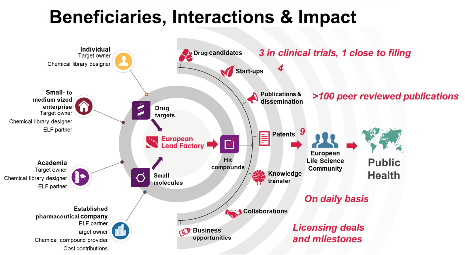 In the final period of the project it became clear that there was not enough support from partners nor were other funding sources available to continue sharing the compound collection and keep the infrastructure running for a 3 years post-term period. To ensure a controlled closing of the ELF and adequate delivery on the QHLs of running programmes, we decided to wind down the ELF, and not establish the envisioned ELF foundation. 2 EFPIA partners will continue compound sharing for another 6 months, to allow them to finalise a few pending programmes. The closing of the ELF marks the end of a highly successful partnership, that has made significant contributions to the European drug discovery ecosystem for over a decade.
