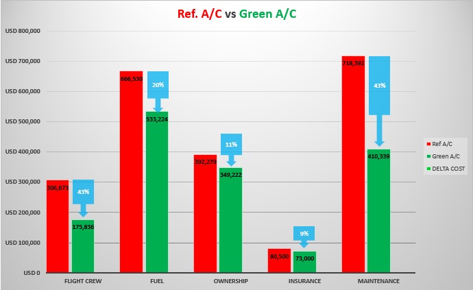 2) Reference and Green Aircraft: the main goal of this activity is to deliver aircraft simulation model for the 19 seats Green configuration Entry Into Service 2025, in order to assess the overall impact at aircraft level of the developed technologies, to forecast both market demand and environmental impact. Aircraft simulation model includes a LCC (Life-Cycle Cost) for the Green SAT aircraft, which has been derived as input to TE for small commuter regional transport.