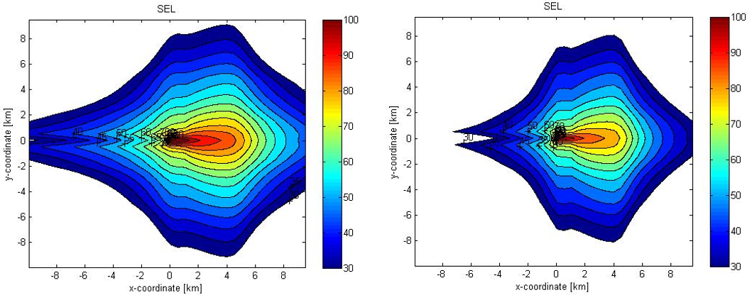 3) Noise emission at the microphone for the Green A/C is about 71 dB(A), against 81 dB(A) for the Reference aircraft.