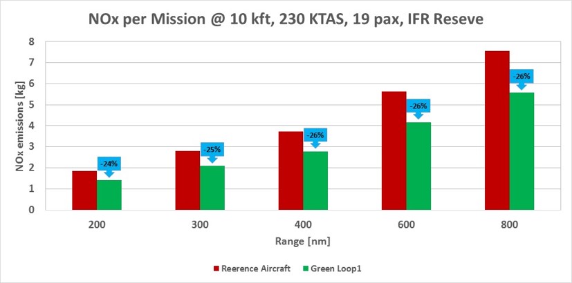 2) NOx emission reduction of the Green A/C with respect to the Reference aircraft is about 25% at 195 KTAS and 24% at 230 KTAS.