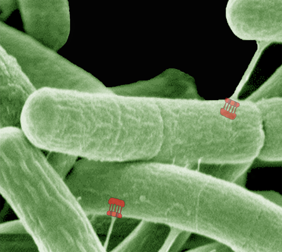 1) We revealed that the CORE provides the basis for a nanotube-organelle that connects pathogenic E. coli (EPEC) to its host, enabling host nutrient extraction (Pal et al., 2019 Cell, Cell cover, Cell featured article, Nature Highlights) (see Figure "Cell cover").