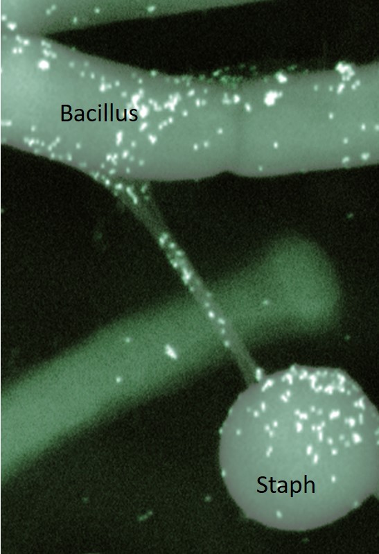 3) We found that bacterial intercellular nanotube connection is enabled by the delivery of lytic enzymes over nanotubes from a donor bacterium to rapture the recipient bacterium cell wall (Baidya et al., 2020 Nature Communications) (see Figure "Bs Sa nanotube").