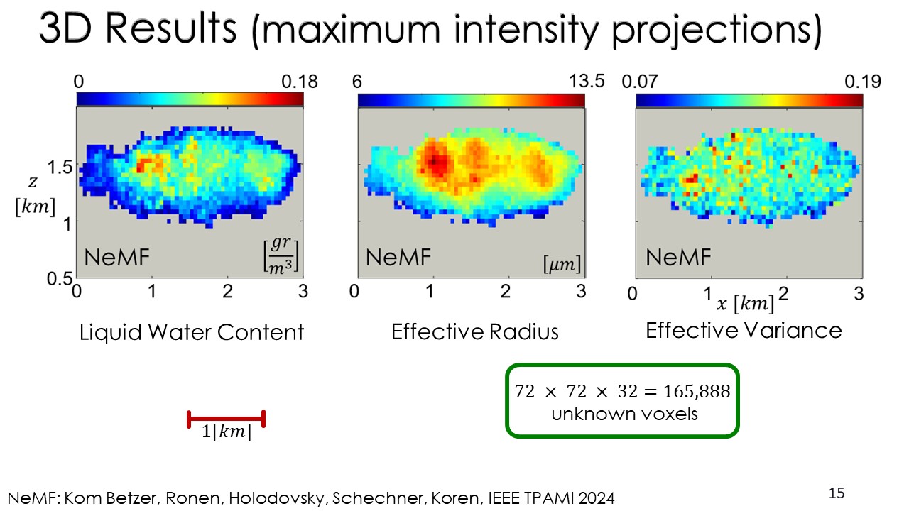 In terms of imaging technologies and algorithms, all that is written above in this context is beyond the state of the art. The methodologies should have long term implications, because they are not specific to clouds in the CloudCT project. Mostly, the results we derive are applicable to various scattering media, including tissue and humans in medical diagnosis, or underwater specimens. We believe the architectures of machine learning for CT of clouds will be also applicable to scattering-CT in biomedical context. In-orbit calibration of polatization response in cameras should be applicable to any future spaceborne projects that would opt to use polarimetric imaging. Now, as the project progresses, we reach convergence of our understanding of many problems in this cross-disciplinary challenge. Consequently, results of different aspects of the project converge. So, by the ned of the project will form a comprehensive toolkit for 3D tomography including 3D retreivals using scattering, that recovers microphysics in 3D, as well as uncertainty measures in 3D. This is expected – by design – to be achieved despite various real-world implefections of sensing, and doing so at fast runtime, to meet communication rates from space.