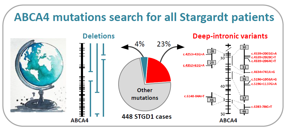 Second, we aimed to identify and characterize missing heritability in the ABCA4 gene in STGD1. Despite genomic advances, 20-35% of STGD1 cases remained genetically unexplained, rendering ABCA4 an excellent model gene to identify and functionally assess missing heritability. Novel therapies are being developed for STGD1 cases that have an unequivocal genetic diagnosis. Here, we identified structural and sequence variants of the ABCA4 locus in monoallelic STGD1 cases. We performed in vitro analyses of ABCA4 splice defects and we identified ABCA4 RNA defects in retinal stem cells of monoallelic STGD1 cases. Lastly, we performed functional studies of ABCA4 cis-regulatory variants such as 5’UTR variants.