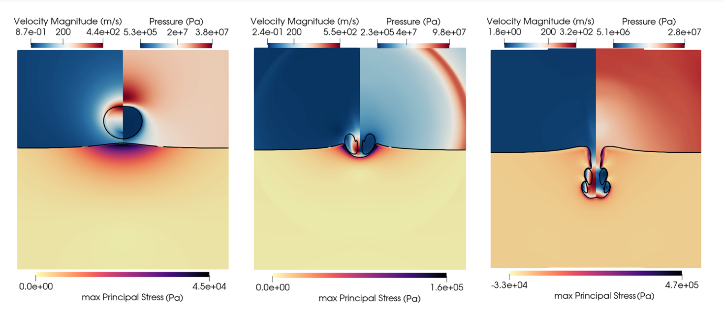 On the modelling side, a wide range of simulations approaches have been developed. The dependence of behavior collapse on the contact angle was explained using the impulse potential flow theory for short times, which shows the presence of a singularity on the initial acceleration of the contact line. The collapse of multiple cavitation bubbles nucleating and collapsing in contact with a rigid wall was also studied to understand the interaction among the bubbles and its consequences. Moreover, numerical simulations utilising real-fluid thermodynamics equations of state for estimating the properties of both the liquid and gas as function of pressure and temperature have been developed, allowing for more accurate prediction of both the gas and liquid temperatures to be predicted during bubble collapses. The interaction of cavitation bubbles with free surfaces was also investigated using a compressible all-Mach number flow solver with interface tracking capability. This shed light to the mechanism of bubble entrainment process. It was found that the oscillatory flow inside the nozzle, naturally accompanied by alternating gradients of pressure, induces flow focusing at the curved meniscus via the baroclinic torque. The misalignment of the density and pressure gradients across the interface induces the generation of vorticity, which in turn, focuses the flow at the level of the meniscus resulting in a bubble pinch-off governed at the last stage by capillary forces. With the same flow solver, immersed boundary methods allowed for fluid-structure interactions and thin elastic capillary to be computed considering surface tension effects. With regards to the interaction of cavitation bubbles with soft material, two different approaches have been developed. The first novel numerical framework has employed a Diffuse Interface Method (DIM) accounting for the interaction across fluid-solid-gas interfaces. It usilised an Adaptive Mesh Refinement (AMR) framework for unstructured grids. The numerical framework was validated for cases of bubble dynamics, under high and low ambient pressure ratios, shock-induced collapses, and wave transmission problems across a fluid-solid interface, against theoretical and numerical results. The detailed collapse dynamics, jet formation, solid deformation, rebound, primary and secondary shock wave emissions, and secondary collapse that govern the near-solid collapse and tissue sonoporation mechanisms was revealed for the first time. Finally, a mess less Smooth Particle Hydrodynamics (SPH) method for liquids was combined by a TL SPH method for solids where the 1st Piola-Kirchhoff stress tensor was considered. This enabled simulations of collapsing cavities (“vacuum bubbles”) in a liquid above or close to a deformable solid object. The developed monolithic approach was successfully tested against reference cases and was applied to simulate the sonoporation process of a collapsing bubble close to a cell membrane, including the breaking of the membrane due to the liquid jet.