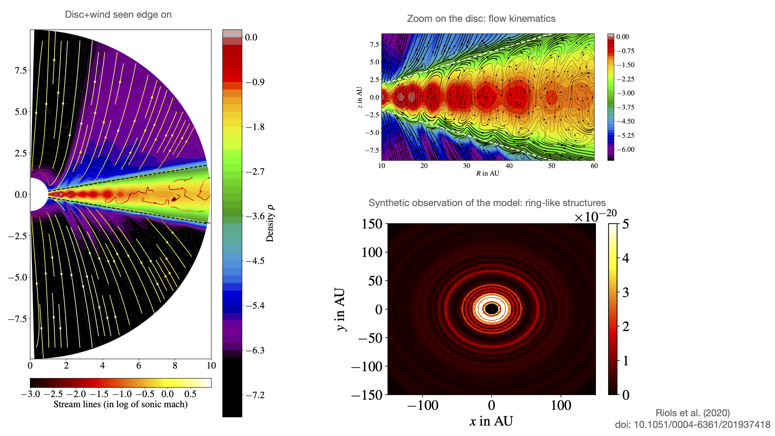 - computed the first global non-ideal MHD simulations of protoplanetary disc with dust, demonstrating that MHD wind can indeed shape the dust disk in lead to observational signatures similar to the ones observed