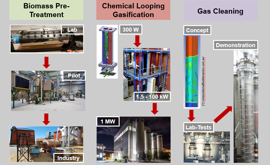 Gasification is a well-known thermochemical conversion strategy, allowing for the production of a high calorific synthesis gas from virtually any solid carbon-based material, which is why it is considered to be a crucial building block in future 2nd generation biofuel process chains. Within the scope of the project CLARA an efficient process chain for the production of liquid fuels based on chemical looping gasification (CLG) of biogenic residues is being developed. In chemical looping, pure oxygen for feedstock conversion is provided through the cyclic reduction and oxidation of a circulating oxygen carrier material (see Fig.1). Hence, CLG facilitates the efficient conversion of biogenic feedstocks into a high-calorific and N2-free synthesis gas, without relying on a costly air separation unit. Moreover, the CO2 formed during the autothermal gasification process can be captured efficiently, allowing for the production of end-products with negative carbon footprint. The advantages of this novel gasification technology are combined with other innovative technologies related to feedstock pre-treatment, enabling the use of low-grade biogenic residues for gasification, and raw gas cleaning, lowering capital and operational expenditures by 30 % compared to state of the art gas cleaning technologies. Consequently, the suggested process chain, schematically shown in Figure 2, allows for significantly reduced biofuel production costs, so that cost-competitive drop-in fuels (0.7 €/l) can be realized.