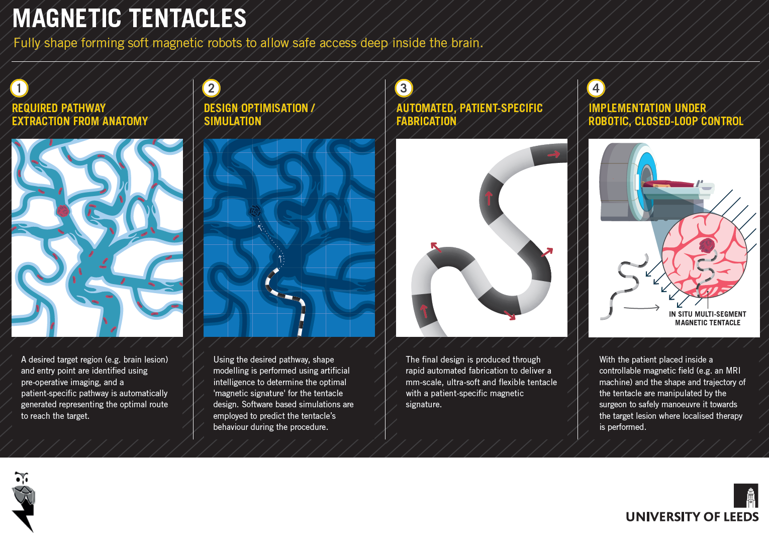 Expected results will be new robotic architectures and models; intelligence and control algorithms for magnetic tentacles; novel techniques for rapid design, simulation, and synthesis of magnetic tentacles; and multi-scale experimental evaluation of magnetic tentacles, embracing different scenarios where control over the entire body of the robot is crucial: lung biopsy, cardiovascular interventions, and neurosurgery.