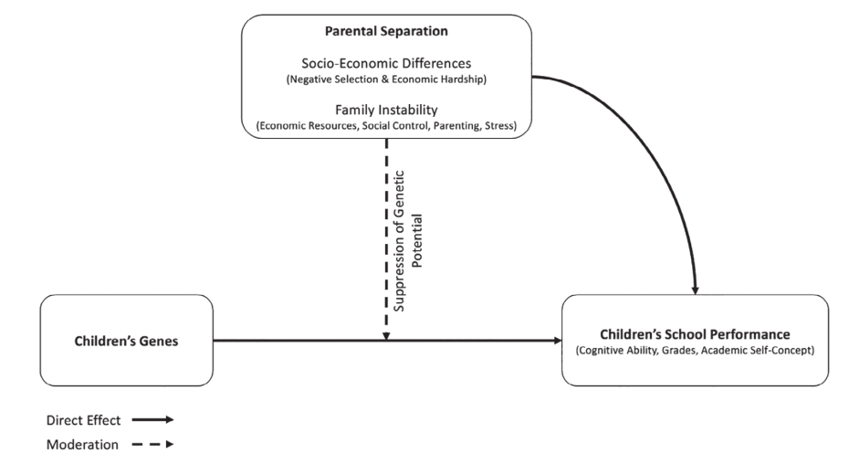 Another important result from the project thus far is that parental separation lowers the importance of genes for children’s school performance. The Scarr–Rowe hypothesis, which states that the relative importance of genes on cognitive ability and related outcomes is higher for advantaged compared to disadvantaged children. Our study expands upon the literature to include family structure as an indicator for advantage/disadvantage, and finds that the relative importance of genes on children’s cognitive ability and academic self-concept is lower for children in single-parent households compared to two-parent households.