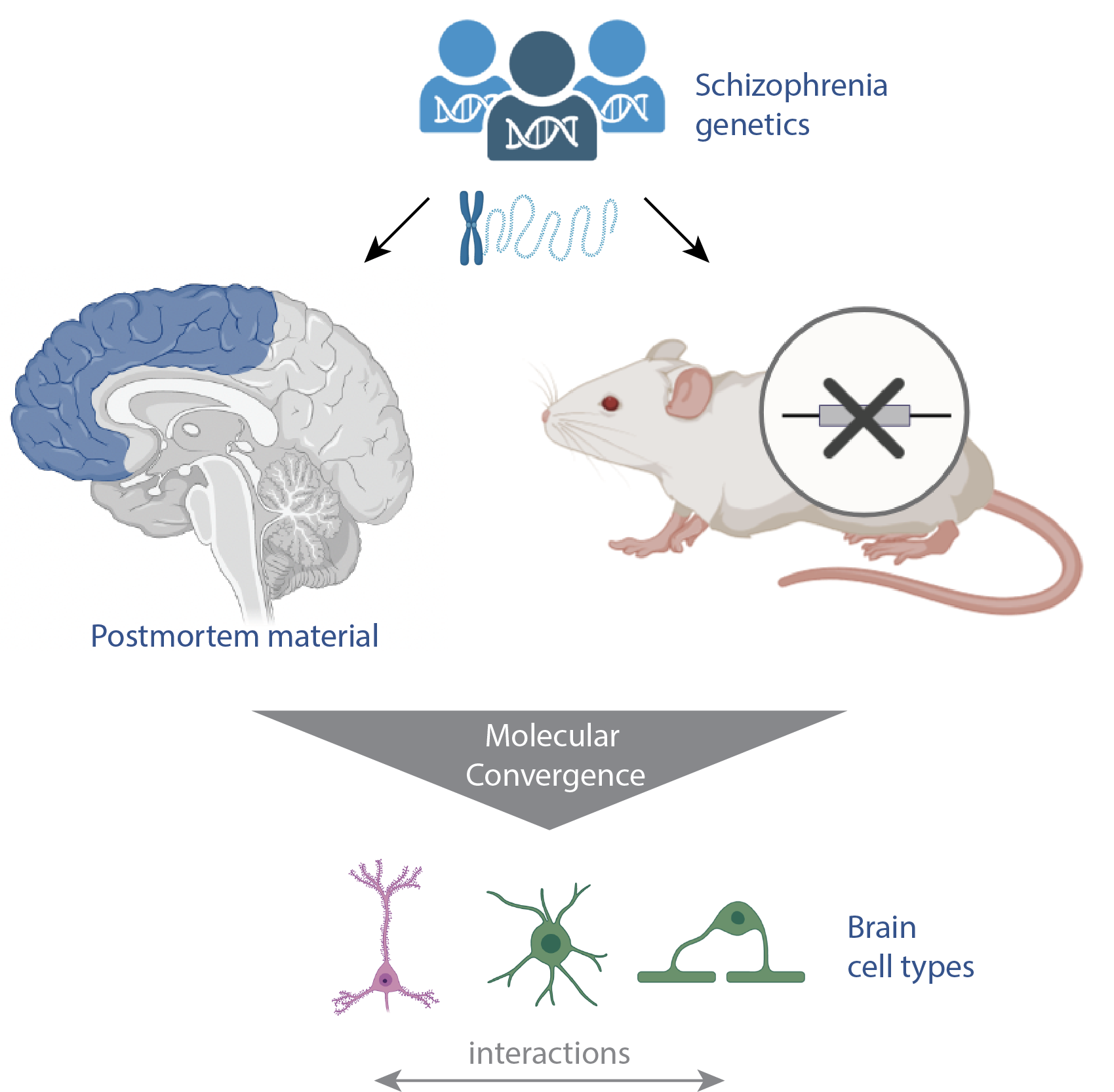 Within SCHIZTYPE we have also performed a large-scale scRNAseq study of postmortem prefrontal cortex tissue from patients who suffered from schizophrenia. First, we observed near-to-no overlap with the findings from the five mouse models. On the other hand, we show that neurons and astrocytes (a type of support cell) have perturbations in the energy supply (mitochondrial function) and that the genetic programs that are involved also contain synaptic genes. Importantly, these genetic programs are also enriched for schizophrenia risk arguing that these changes are casual, rather than due to the disease. We have also performed transcriptomic analysis on tissue sections from human postmortem material which confirmed the findings from the scRNAseq study that we do not see any gross changes in the number of different cell types or their location in patients.