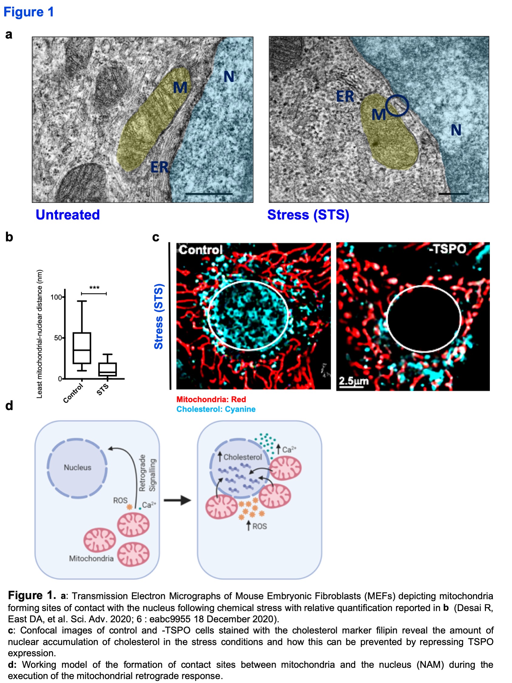 In detail we are investigating how the accumulation of cholesterol on the outer mitochondrial membrane, which is a signature of modified mitochondrial function, relays stress to the nucleus to command pace and quality of genes transcription.