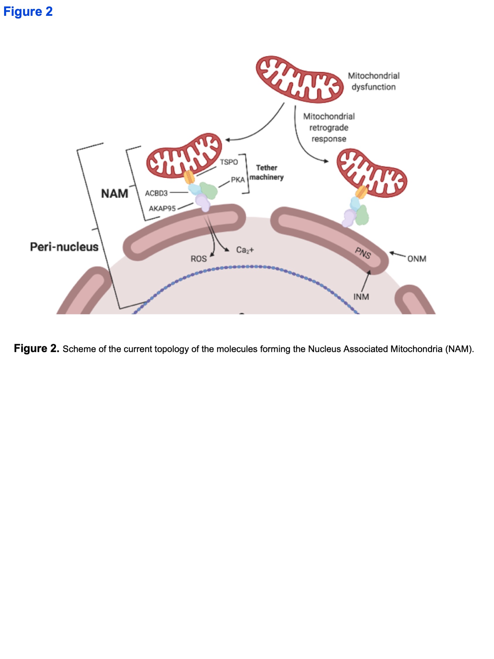 Furthermore, we showed that c) the formation of NAM relies on the formation of a proteic complex which sees TSPO on mitochondria and AKAP-95 on the nucleus (Figure 2). Along with clarifying the precise topology of the tether we are now profiling the signalling depending on the formation of NAM as well as testing their regulatory role in cell pathology.