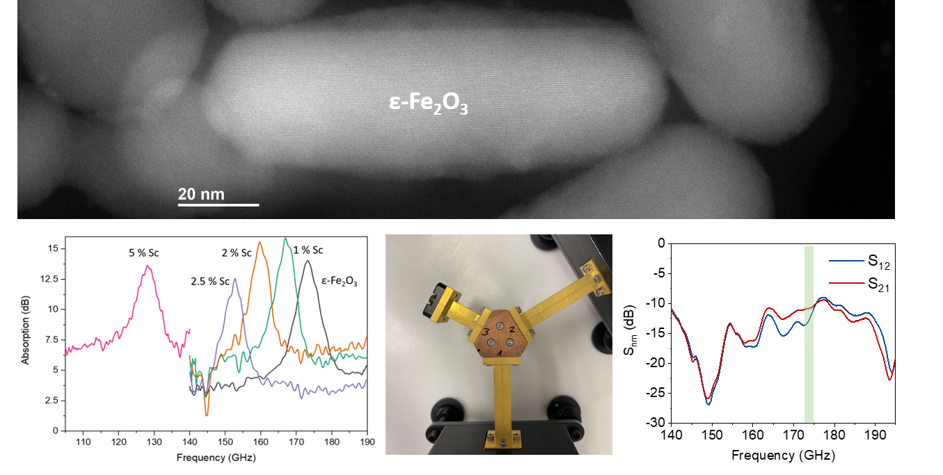 FeMiT has focused on enabling the mm-wave transition for a key component of wireless communication systems: the circulator, which isolates emitting antennas from one another and allows simultaneous transmission and reception. More specifically, the overarching goal of FeMiT was to develop a new family of ferrites that can be used to fabricate miniaturized mm-wave circulators. The ferrites currently used in circulators can only operate in the first portion of the mm-wave band, using external magnetic fields, which makes the device bulky, expensive and can only work at one frequency. The key functional property of ferrites exploited in circulators is their ferromagnetic resonance (FMR), by which, at a given frequency, the propagation or absorption of electromagnetic waves through a ferrite is non-reciprocal, i.e. it depends on their direction with respect to the magnetization. Since the frequency at which the FMR occurs increases with the magnetic anisotropy of the ferrite, very high magnetic anisotropy ferrites are needed for operating at mm-waves. FeMiT has been developing a new family of ferrites based on epsilon-Fe2O3, a material with a high magnetic anisotropy, which can work in non-reciprocal wireless components at higher frequencies without the need for external magnetic fields. Moreover, we have investigated how the magnetic anisotropy of epsilon-Fe2O3 can be modified by strain, as a way to tune its FMR and the operation frequency of circulators based on this family of ferrites.
