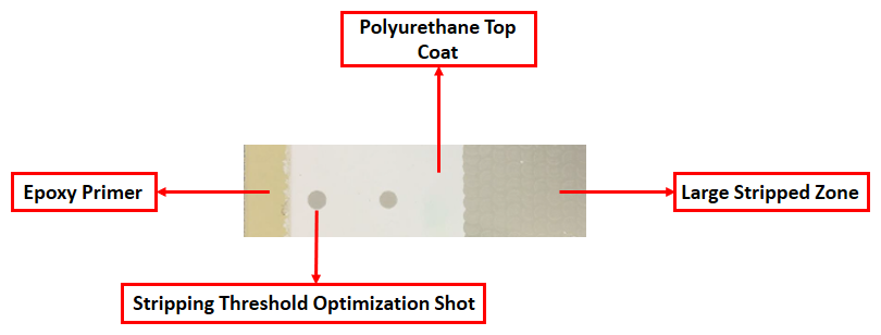 laser-induced shock waves in a confined regime. Power density is studied as a parameter for selective Laser Paint Stripping Process (LPSP) on specimens and for paint adhesion relations. A flashlamp-pumped Nd:YAG lasers with fixed spot size (4mm) is shot on single layer epoxy and several layers of polymeric paint applied on AA 2024-T3 (Aluminium), AL-Li 2060 and CFRP based substrates. After laser treatment, samples are investigatedwith optical microscopy, profilometer and chemical analysis (FTIR, DSC & TGA). The results show that selective laser stripping is possible between different layers of external aircraft coatings and without any visual damage on the substrate material. In addition, paint stripping is developed from the paint side of specimens with the usage of thermal layer for single layer of epoxy coating. In parallel to the experimental work, a numerical model has been developed to explain the background of the physical mechanisms and to evaluate the detailed stress analysis and interfacial failure simulation both for the laser stripping from the substrate side and the paint side applications. The work covers the background and specifications for the laser paint stripping. Afterwards, samples, tools and lasers are presented. In the third part of the manuscript, behavior of aluminum based materials, aluminum tape, epoxy primers, polyurethane top coats and CFRP under lasershock loading is conducted. In the fourth part, laser paint adhesion tests are demonstrated as function of different coatings’ layer thickness, specimen thickness, surface treatment, layer type, substrate type and thermal ageing. The common process window is defined by