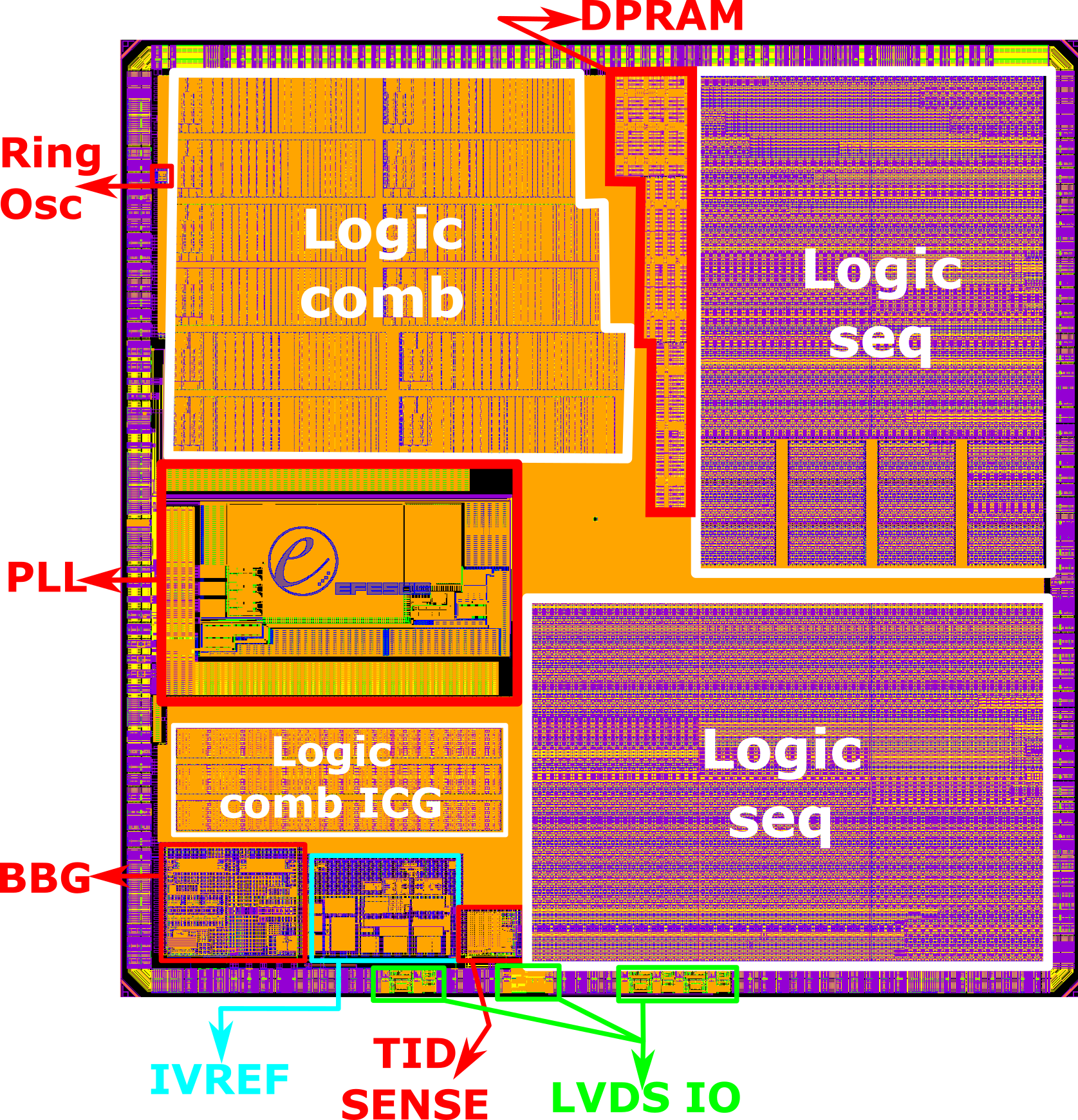 Digital Core gates, IO modules, Back Bias Generator (BBG), TID Sensor, Stub Series Terminated Logic (SSTL) modules, PLL clock generator, Oscillator, Power Management Unit, IV Reference, LVDS.