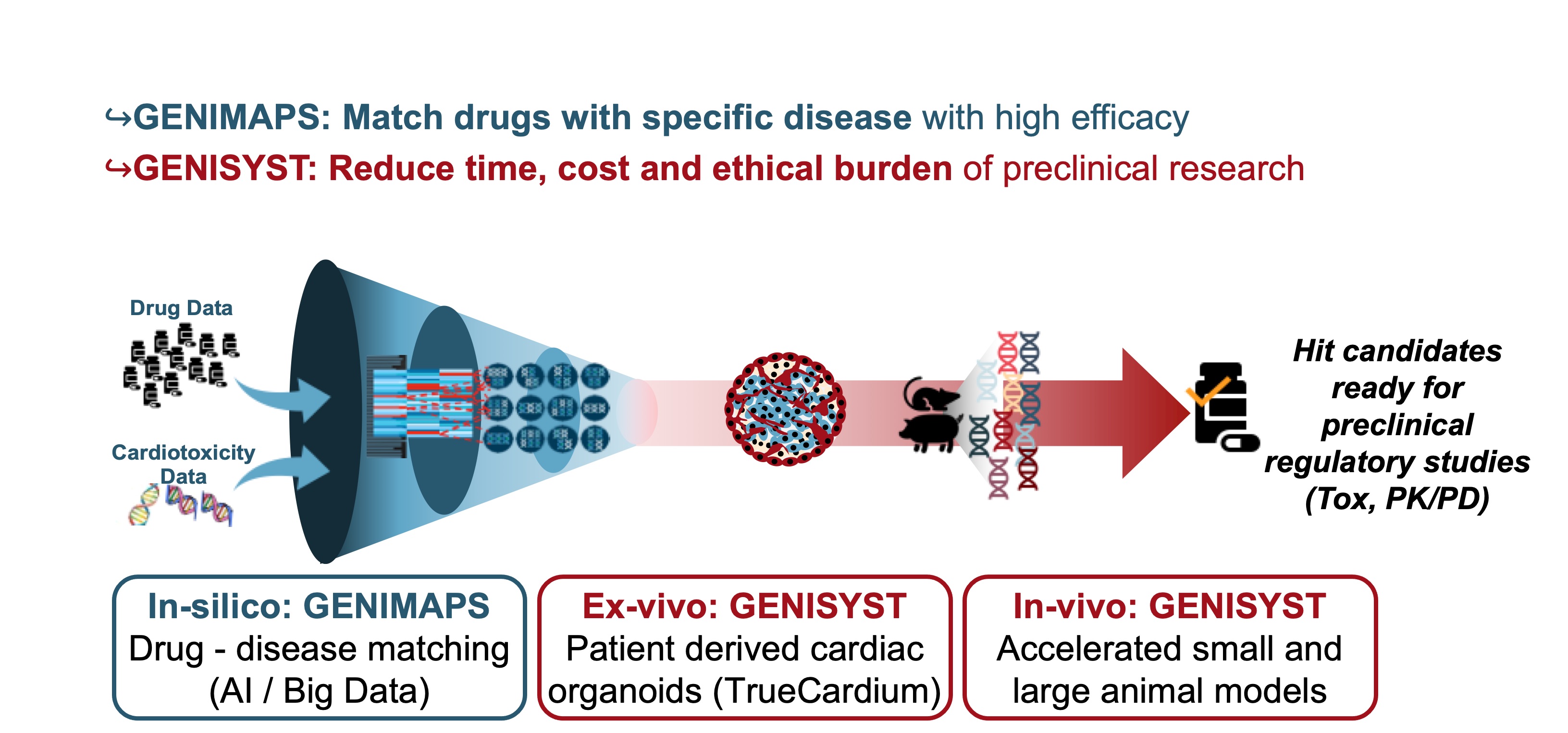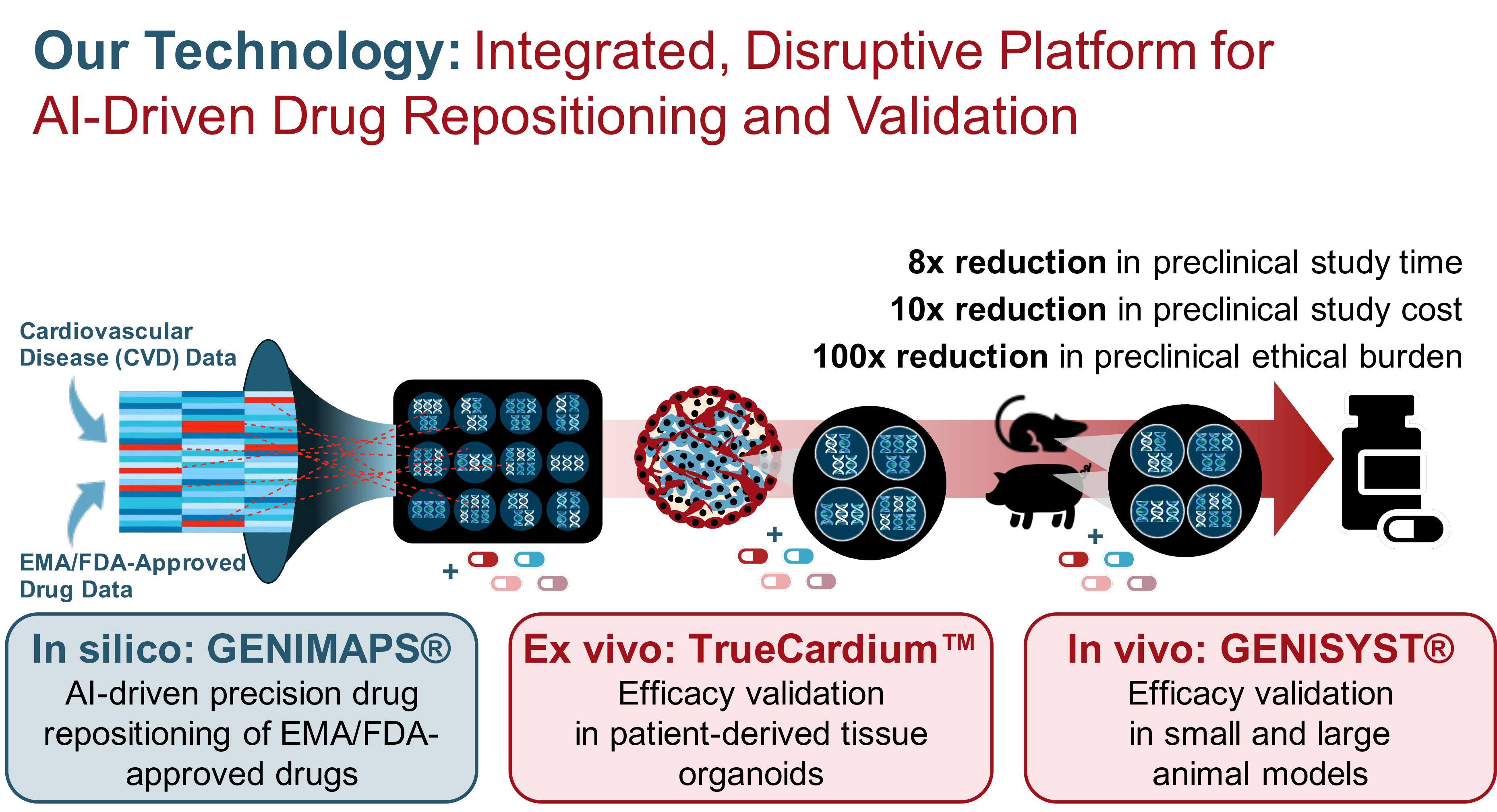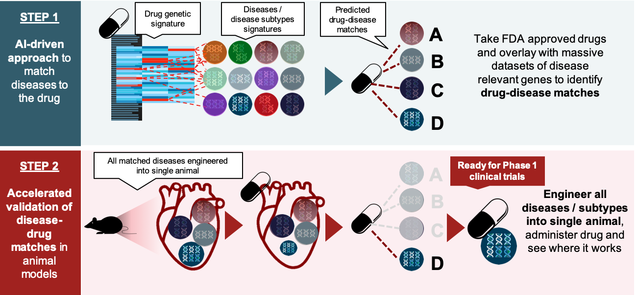 Our AI-driven Drug-Disease matching platform works in concert with the patented multi-disease modeling technology facilitating more efficient and ethical drug development and positioning. The toolkit reduces the time to prepare animal models, and the cost of drug discovery and pre-clinical trials, by an order of magnitude. The impact of this is cheaper, more rapidly developed drugs, with a greater target to market success rate.