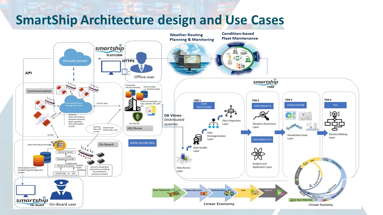 The SmartShip project capitalizes on available COTS technologies and limited RTD, and delivers an ICT & IoT-enabled holistic cloud-based maritime performance & monitoring system, for the entire lifecycle of a ship, by optimizing energy efficiency, emissions reduction, fuel consumption, and in parallel includes circular economy concepts in the maritime field. SmartShip is motivated by the necessity of bringing together Information and Communication Technologies (ICT) of focused Universities, Research Institutions and Companies from the maritime sector. SmartShip introduces a holistic integrated ICT-based framework for the sustainable, individualized and completely automated energy management of ships, offering a multi-layer optimization in the fields of fuel consumption, energy efficiency and emissions control, in full respect to the implementation of the requirements of maritime regulations (Annex VI of the IMO MARPOL Convention and of Directive 2012/33/EU). The Specific objectives of the SmartShip project were fully met: 1. Marine market needs in energy efficiency and emissions control in parallel with end users’ requirements, towards the definition of accurate, industry-driven case scenarios were accurately described 2. Knowledge exchange between academic and non-academic experts was fostered 3. A Data Analytics and a Decision Support Tool were developed which compile data from existing sensing devices in vessels, manage the operation of the whole IoT environment, and run optimization algorithms to provide suggestions related to the operation of the ship 4. Existing infrastructure in ships and the technologies investigated and developed in Objective #2 were fully exploited in order to enhance the implementation of Circular Economy in the maritime field, in terms of management of engines’ components 5. A holistic framework for energy efficiency and emissions control in maritime through the implementation and validation of new tools (see objectives #3) was offered and integrated with the existing ones (objective #2), for optimizing the efficiency of daily operations 6. The system's effectiveness based on real-life use cases towards the reinforcement of the European Maritime Industry was demonstrated 7. New long-lasting research collaborations were developed and the transfer of knowledge between participating organizations was achieved while an improved research and innovation potential, through the development of training material towards long-term sustainability and exploitation, was fostered