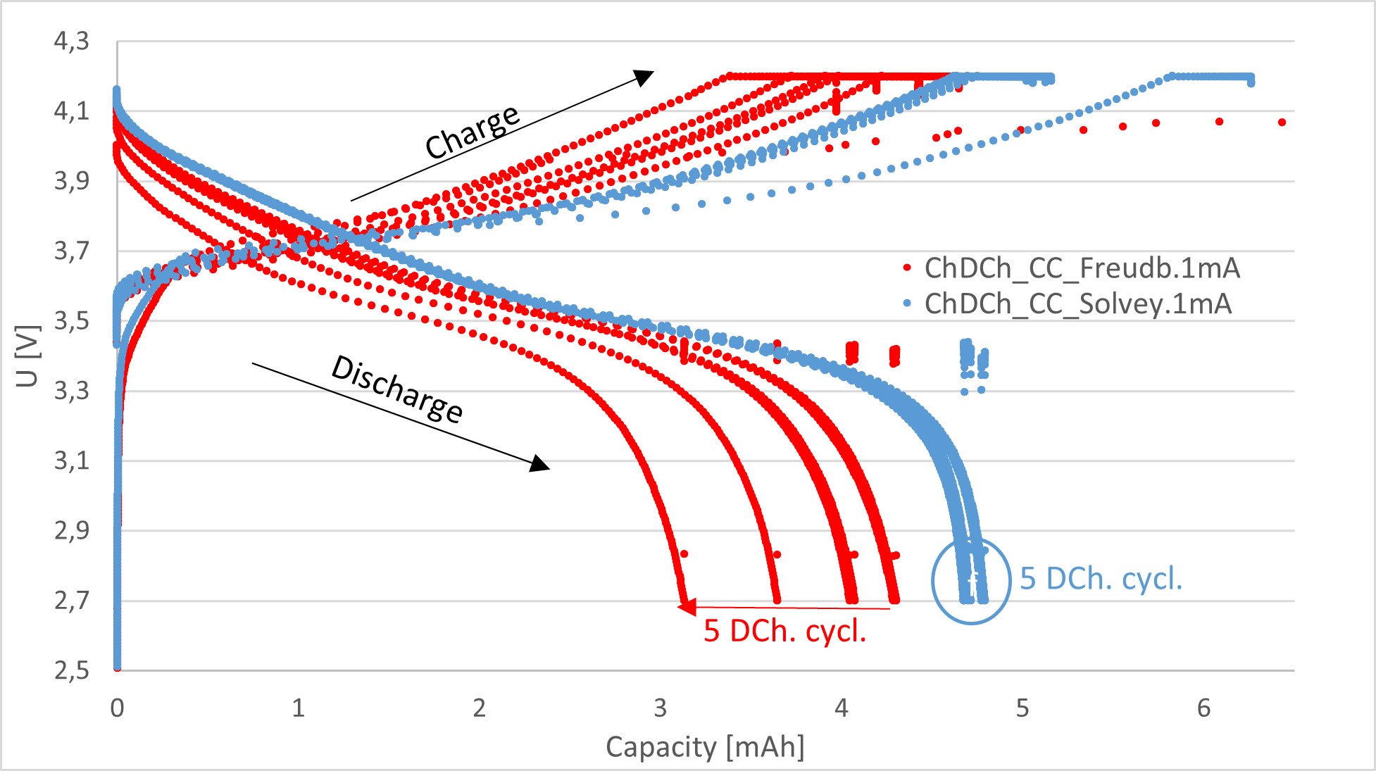 First rechargeable printable Li-ion battery based on PEO/LiTFSI membrane has been demonstrated. Cycling tests up to 150 cycles have been done.