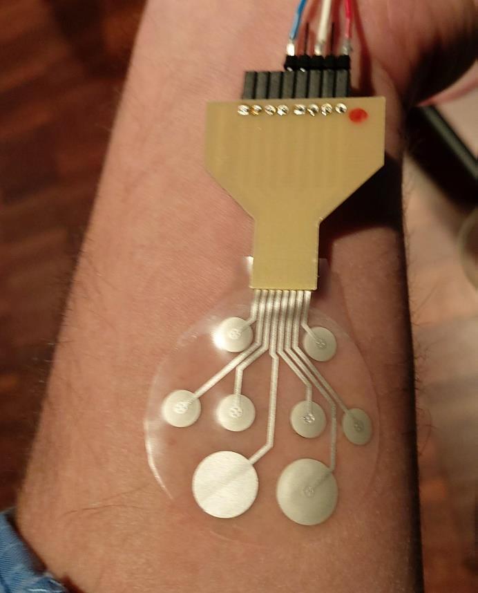 Reliable electrical vias on TPU proven in stretch testing and used to implement a stretchable skin electrode layer of the skin patch. (New structural solutions towards stretchability.)