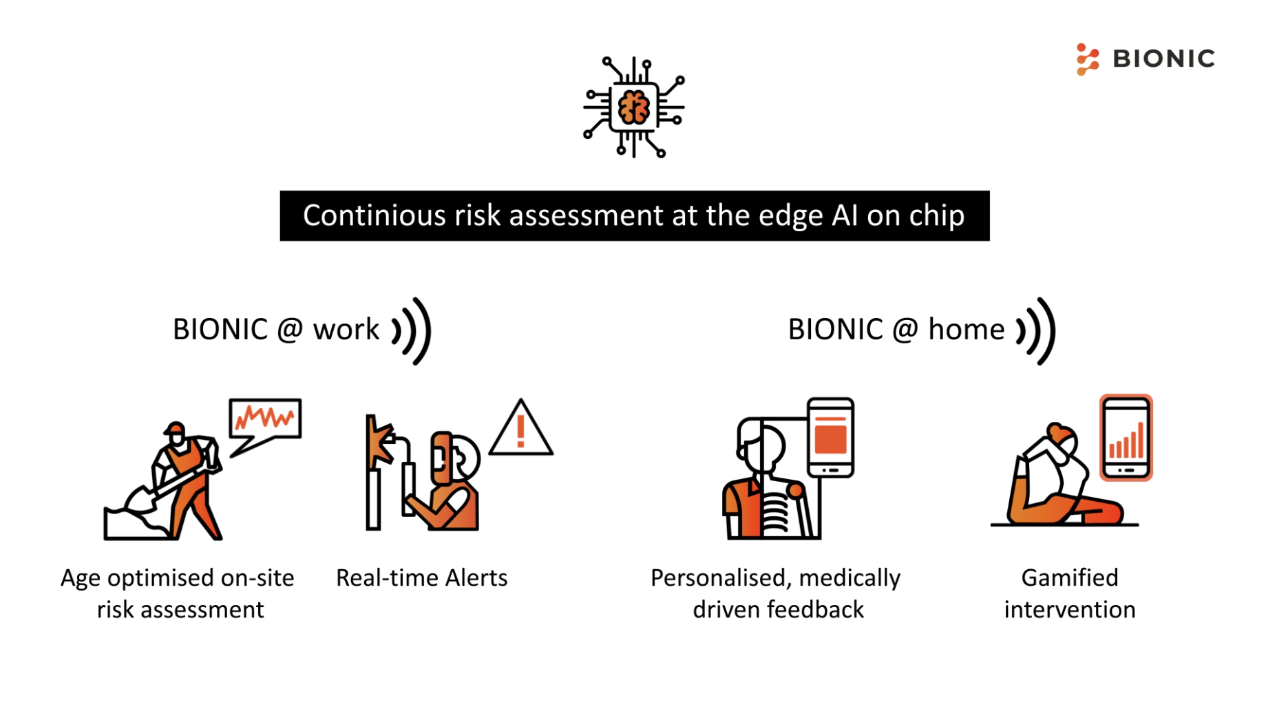 BIONIC is a European research project that developed a mobile, unobtrusive and privacy preserving platform for real-time ergonomic risk alerting and coaching, enabling the design of workplace interventions adapted to the needs and fitness levels of specific ageing workforce. Optimal engagement of the workers is supported by motivating, gamified education elements for prevention and self-management of musculoskeletal health in any working/living environment.