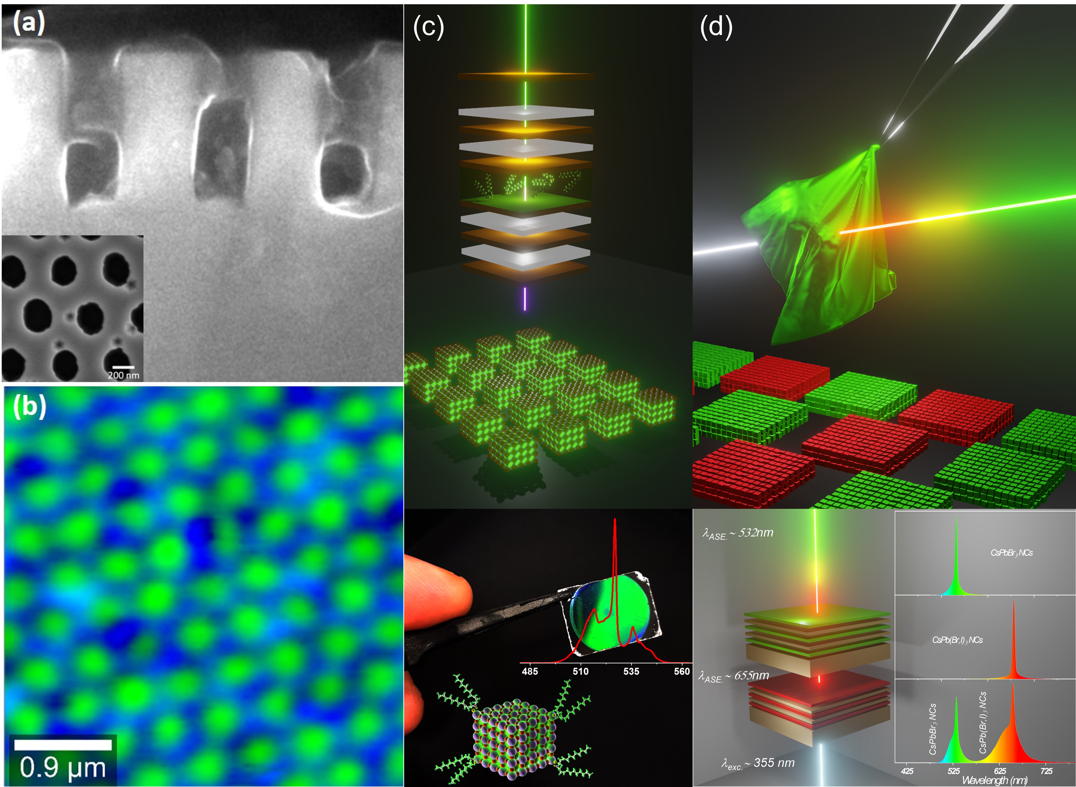 The present project aims to develop, new and efficient hybrid emitter system based on the integration of III-nitride LEDs and LHP NCs, allowing them to exploit the strengths and potentials of both material families. The proposed work focuses on the study and optimization of the down-conversion of nitride emission involving the NCs using two approaches: (i) via radiative pumping in which UV/blue photons emitted from InGaN LEDs are absorbed by the LHP NCs and converted efficiently to longer wavelength photons, (ii) via Förster resonant energy transfer (FRET) in which energy channelling occurs non-radiatively via dipole-dipole coupling. The latter approach could overcome intrinsic limitations of the radiative pumping process which is relatively inefficient and slow. Eventually the synergy of processes (i) and (ii) will be sought to mediate the light emission process in the novel light emitting structures of the project.The development of novel and efficient white light LEDs, apart from the explicit applications in solid state lighting, will benefit several other commercial sectors such as displays, data communications, machine vision and biomedicine. For display applications, down-conversion via LHP NCs offers high colour saturation and purity due to their narrow emission linewidths. Visible light communication (LiFi) is expected to grow rapidly to meet the increasing demand of data transmission speed and bandwidths over the last years; the combination of nitrides with LHP NCs appears highly suitable for such applications, as they both exhibit fast radiative rates, allowing in principle such hybrid devices to operate at high modulation frequencies necessary for high data transmission rates. The aforementioned outcomes would greatly affect the wider society and public, as it is expected to have a great impact on the quality of life and economic growth in the future. The initial project objective is the study and optimization of the radiative- and non-radiative light down-conversion from an optically-pumped blue emitting LED based on InGaN/GaN multiple quantum wells (MQWs) to green/red absorbing LHP NC layers. In order to activate FRET, the use of nanostructured InGaN structures will be sought to allow a close proximity of nitride and NC excitations that can be coupled via the strong dipole-dipole interaction. The second objective of the project will be to develop the idea in order to demonstrate multicolor and white light emission via non-radiative and/or radiative pumping of LHP NCs from electrically excited, nanostructured InGaN-based LEDs. Finally, the project aims to investigate optically pumped LHP NCs for lasing applications, via electrical excitation of InGaN/GaN LEDs by employing a more elaborate structure design of a double-microcavity arrangement.