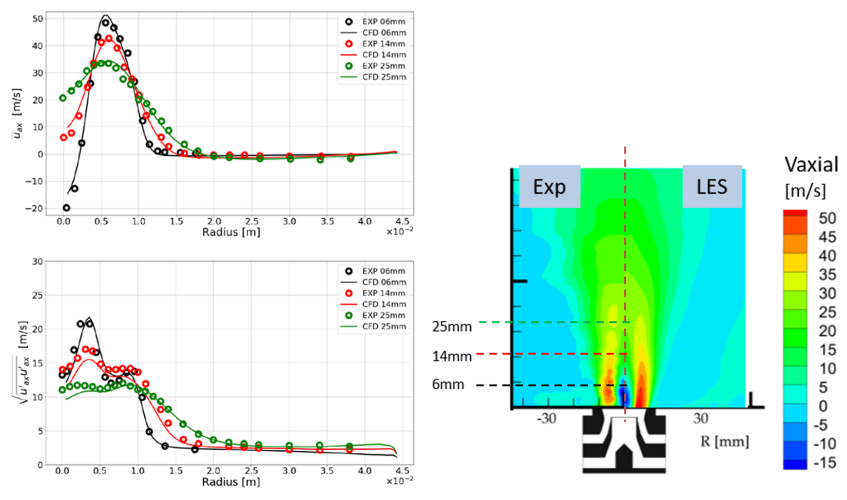 The main goal was to define a representative numerical setup for LES investigations. Results related to the validation of the computed flowfield in isothermal conditions are reported in Figure 4.