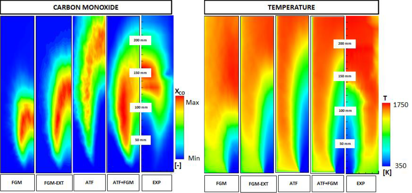 LES turbulent combustion models were considered to validate basic low-swirl lifted flame prediction. Investigated models belong to FGM family (with heat loss and flame stretch effects ) and ATF. A hybrid ATF-FGM model was also tested. Figure 5 reports a comparison of some of the tested models against measured CO and temperature. LES results permitted to deeply investigate the flame stabilization process (Figure 6).