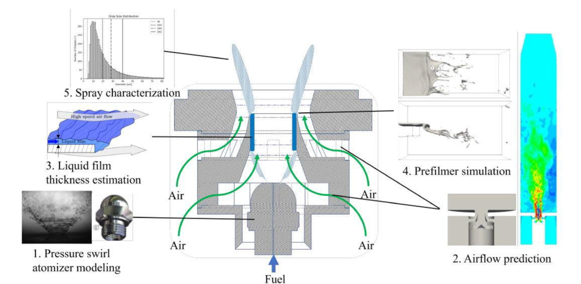 - Development of the Eulerian-Lagrangian-Spray-Atomization model to accurately describe typical airblast atomizers used in aeroengines.