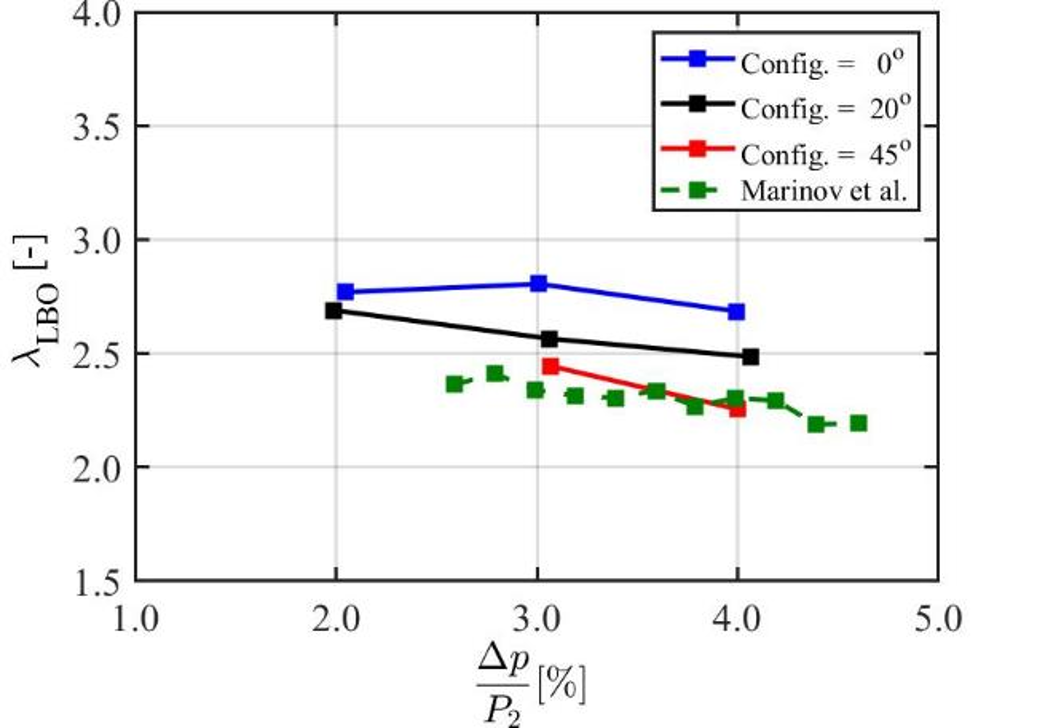 A series of experimental tests were conducted at a multi-burner array test rig consisting of up to five modular burners at different inclination angles, equivalence ratios, air pressure drop across the nozzle, and varied air inlet temperature at ambient pressure. Figure 10 reports the stability of studied solutions as a function of pressure drop. Figure 11 is summarizing NOx emissions for two cases varying inlet air temperature.