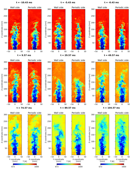 LES investigation of the LBO transient of the multi-burner rig was carried out for the inline case, confirming the key role of outer recirculation in flame stabilization. A series of temperature snapshots during flame blow-off is reported in Figure 15.
