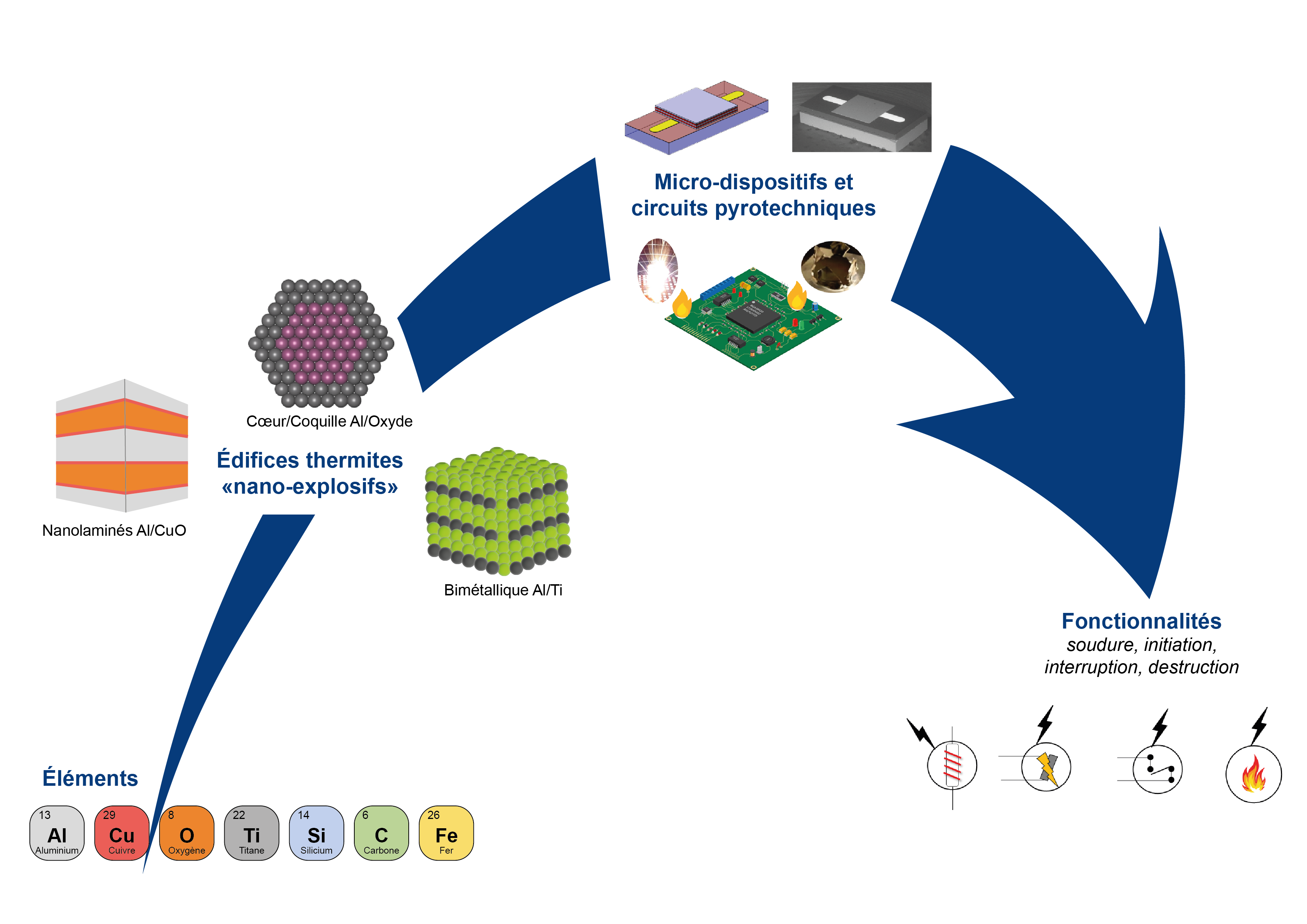 From a basic science perspective, all the experiments (STEM-EELS and videographies) and modelling efforts (DFT, ReaxFF MD, CFD models) permitted unprecedented progress into thermite ignition and combustion mechanisms. The redox reaction between a solid fuel and oxidizer is primarily governed by the migration of oxygen (triggered at temperature of 350 °C) and counter diffusion of Al ions (triggered around the melting of Al). This process begins with oxygen release from the oxidizer, followed by their transport through the reactive interface and medium, culminating in the formation of the final oxide product. When in contact with Al, CuO was observed to decompose at a significantly lower temperature than its known thermal decomposition threshold of 1248 K, a phenomenon we understood thanks to MD simulations. At higher temperature Al/CuO thermites follows a heterogeneous gas-solid mechanism.
