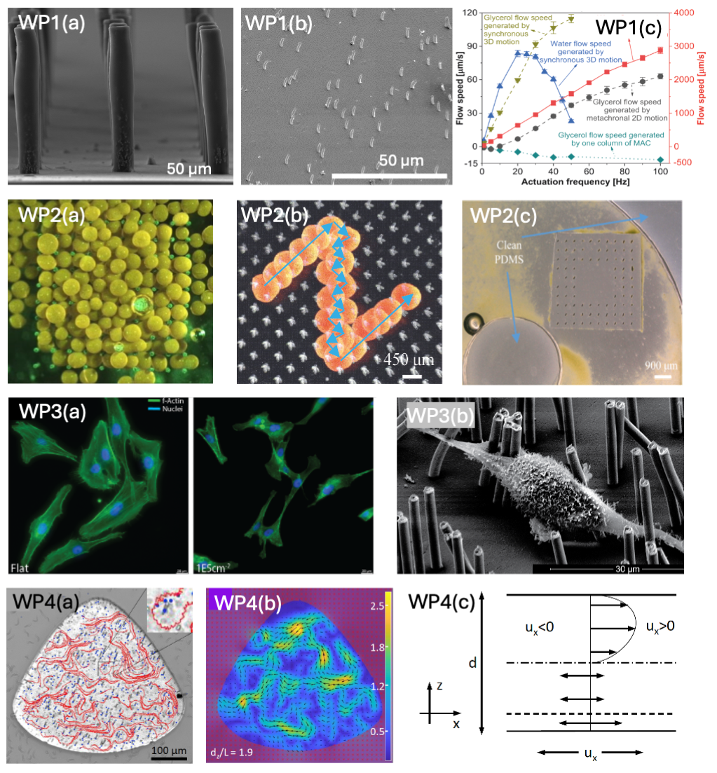 We demonstrated that our MAC could generate substantial fluid flow in a controlled fashion (Fig. WP1c), and that we can use them as microfluidic flow sensors. Also, we showed that the MAC can be used to clean surfaces (Fig. WP2a), to transport particles in a controlled manner (Fig. WP2b), and even to create anti-biofouling surfaces (Fig. WP2c). In this work, we have combined experimental studies with numerical simulations to obtain thorough understanding of the mechanisms at work. This answered question 1.