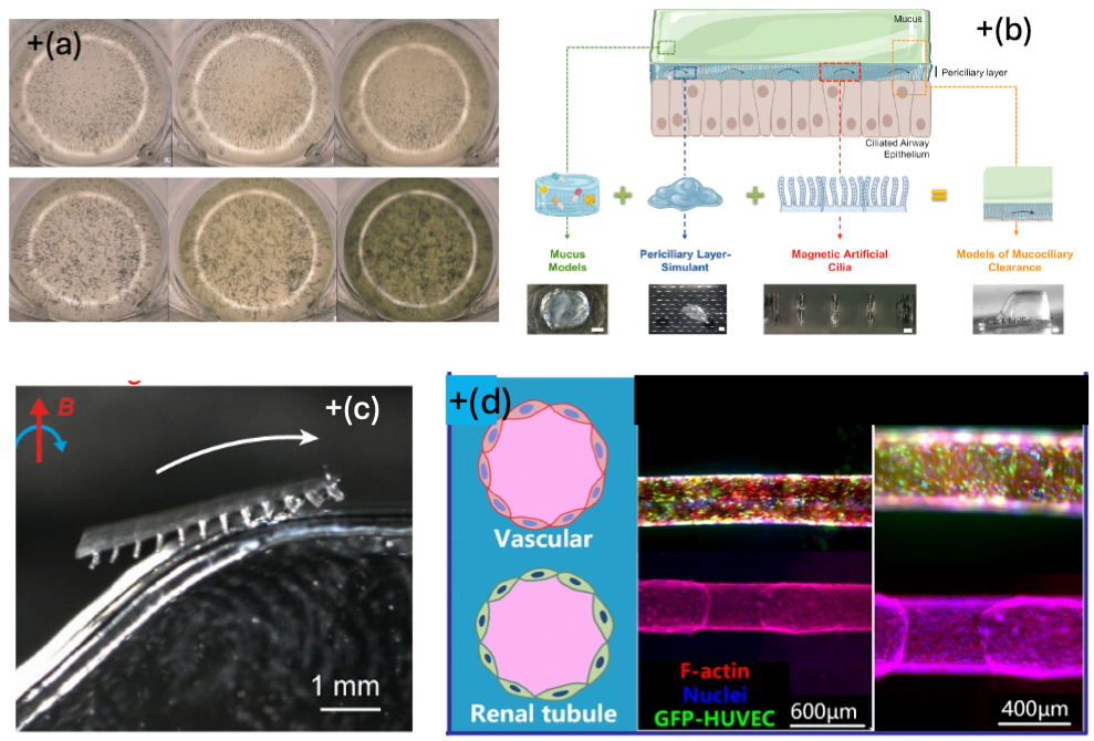 Next to these results, the research of Bio-Plan has generated results we had not anticipated or planned in advance, in different areas, including algae growth methods (Fig. +a), a lung clearance model (Fig. +b), microrobots (Fig. +c), and micromixing. However, the most important one was the of a novel method to create very small tubular lumens in microfluidic devices, enabling to mimic small blood vessels or other tubular structures such as renal tubules (Fig. +d). This technology will enable us to create organ-on-chip systems with relevant applications in the future, such as organ models for cancer research.