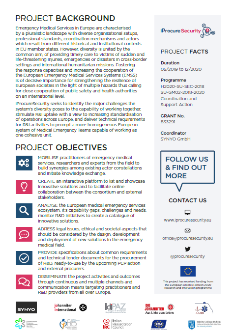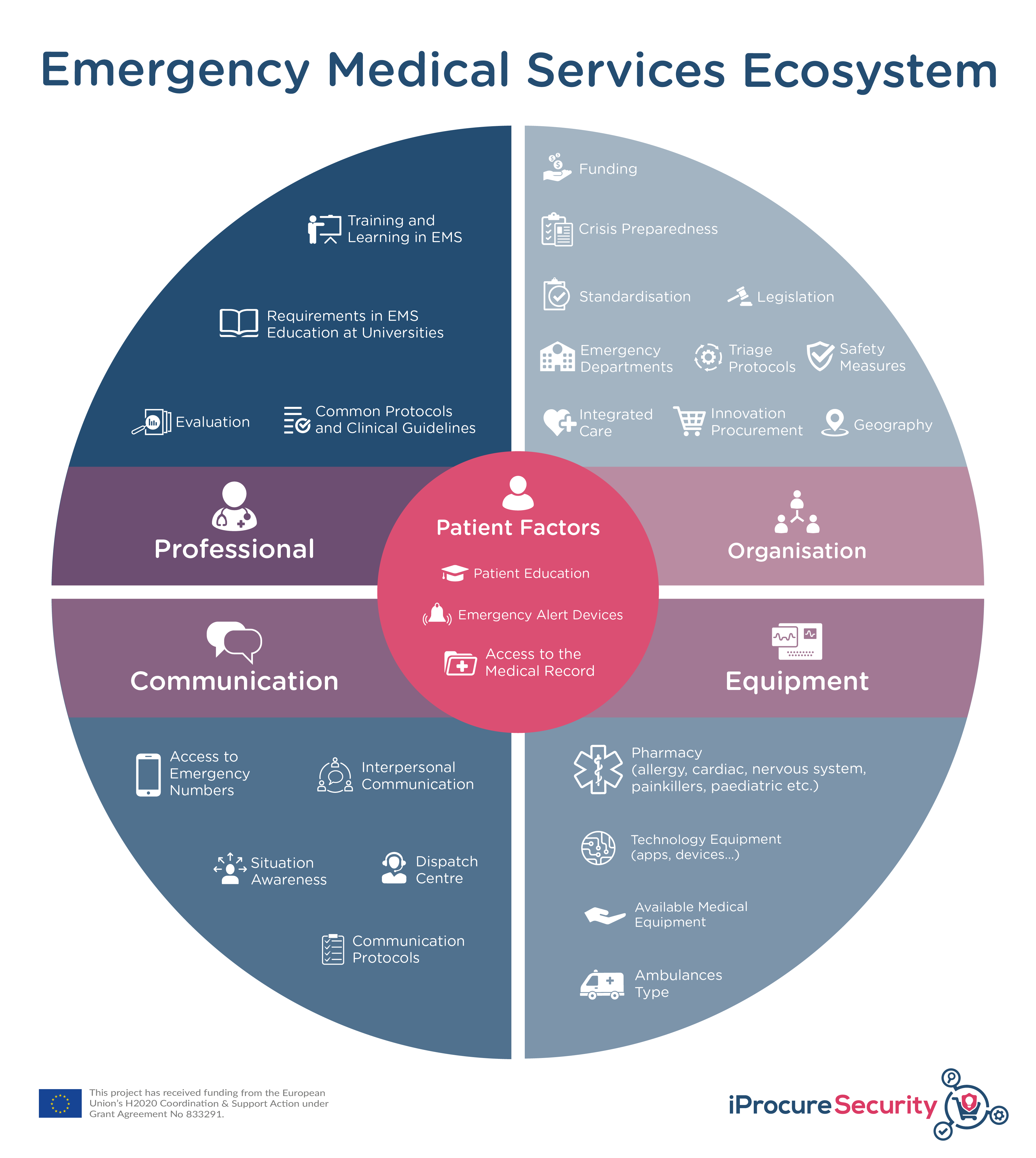 iProcureSecurity responds to this challenge by seeking to identify the major issues the diversity of the emergency ecosystem poses to the capability of working together, stimulate R&I uptake with a focus on increasing standardisation of operations across Europe, while delivering technical requirements for R&I activities to prompt a more homogeneous European Emergency Medical Services System.