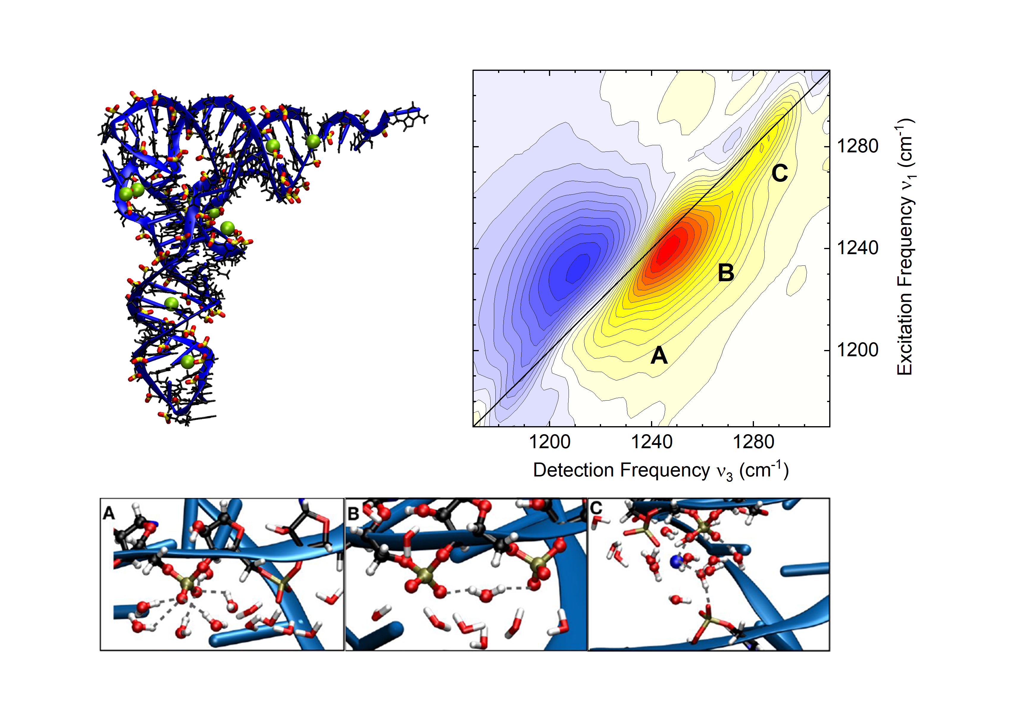 The water geometries at the surface of double-stranded helical RNA and transfer RNA (tRNA) were studied by 2D-IR spectroscopy of vibrations of the RNA backbone which serve as noninvasive probes of local interactions. The 2D-IR spectra of the asymmetric phosphate stretching vibration of tRNA reveal three prototypical hydration motifs (see Figure), a local hydration shell consisting of six water molecules forming hydrogen bonds with the free phosphate oxygens, an ordered water geometry in which individual water molecules bridge neighboring phosphate groups, and hydrated contact pairs of phosphate groups with counterions. The spectroscopic observations were analyzed by in-depth theoretical calculations and molecular dynamics simulations. RNA melting leads to a decrease of ordered structures in favor of local hydration shells. Librational water motions lead to structural fluctuations on a time scale of 300 fs while hydrogen bond lifetimes and reordering times of ions are much longer.