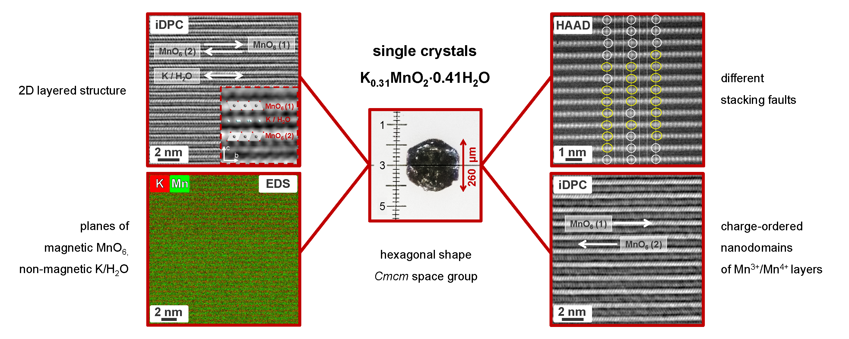 2. The largest single crystals of potassium manganite reported thus far, with composition K0.31MnO2·0.41H2O were grown and studied in detail. For the first time, structural characterization was carried out using a combination of single-crystal XRD and high-resolution scanning TEM, which revealed a number of complex features including manganese charge ordering, structural modulation, and widespread stacking faults.
