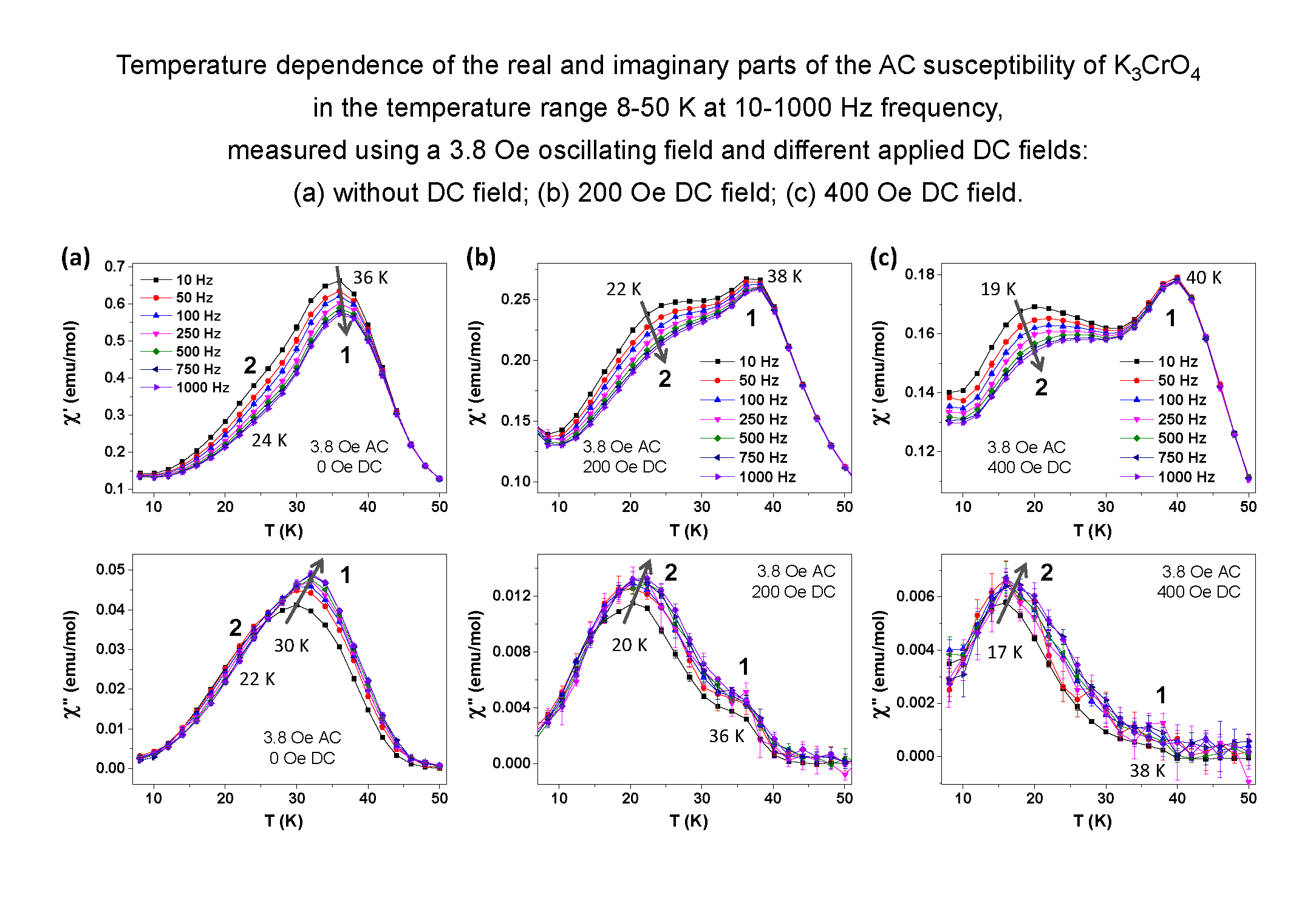 3. The magnetic behavior of the geometrically frustrated compound K3CrO4 was explored for the first time. This complex oxide is a 3d1 system (S = ½) with the unusual 5+ oxidation state of chromium. The crystal structure, static and dynamic magnetic properties of the compound were investigated in detail. The presence of several magnetic phase transitions was found on cooling, involving the appearance of canted antiferromagnetic order followed by the onset of cluster glass behavior below the freezing temperature. Further field-induced, temperature-dependent transitions were found at lower temperatures of 3-10 K.