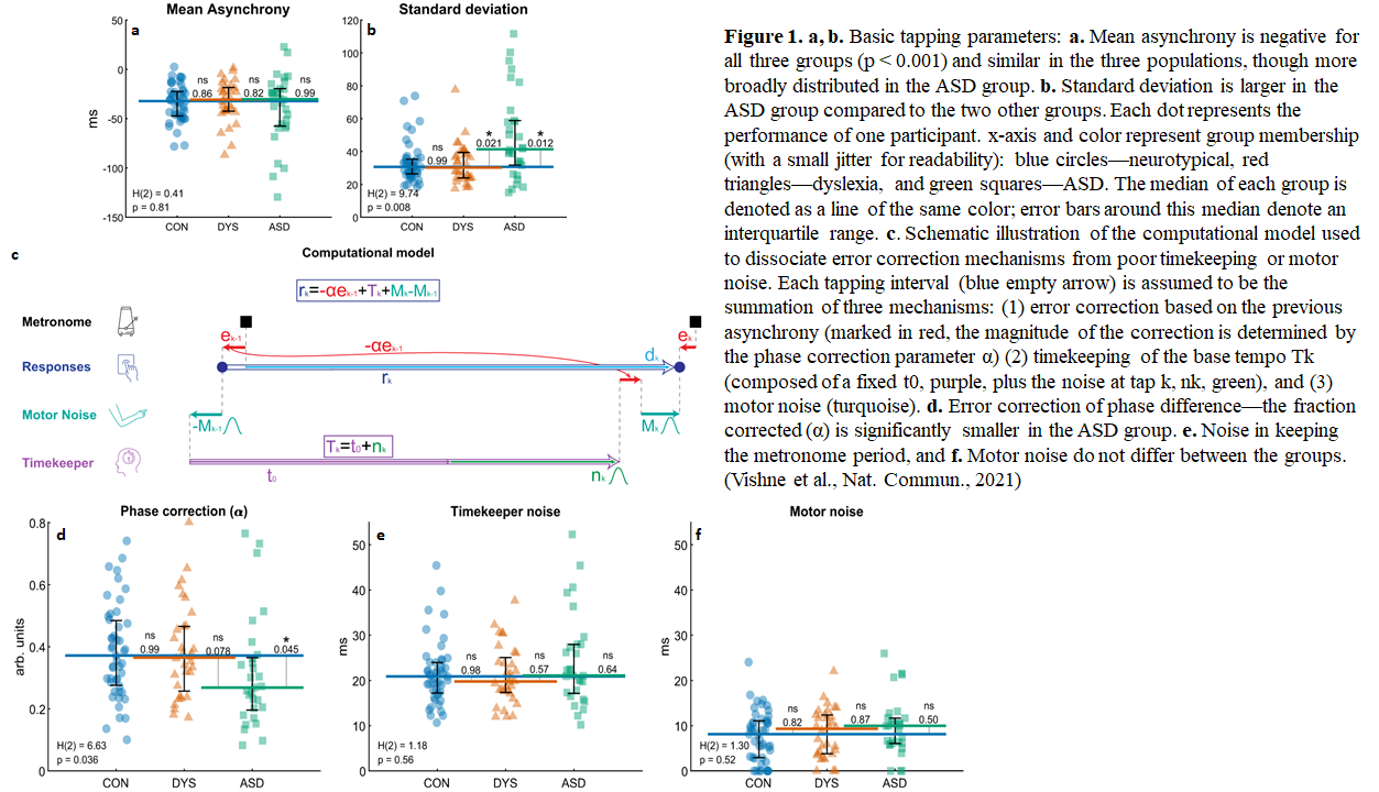 A. We made substantial progress in measuring behavioral difficulties in detecting temporal regularities, in dyslexia and in autism compared to the general population (WP1). We found that, as we hypothesized, people with autism have difficulties in fast updating of their motor plans, as manifested in paced finger tapping, where people with autism are much more variable. Modelling the tapping data (WP3) allowed us to specifically locate the difficulty to slow error correction rather than to generally noisy representation of temporal intervals (Vishne et al., Nat Com, 2021).