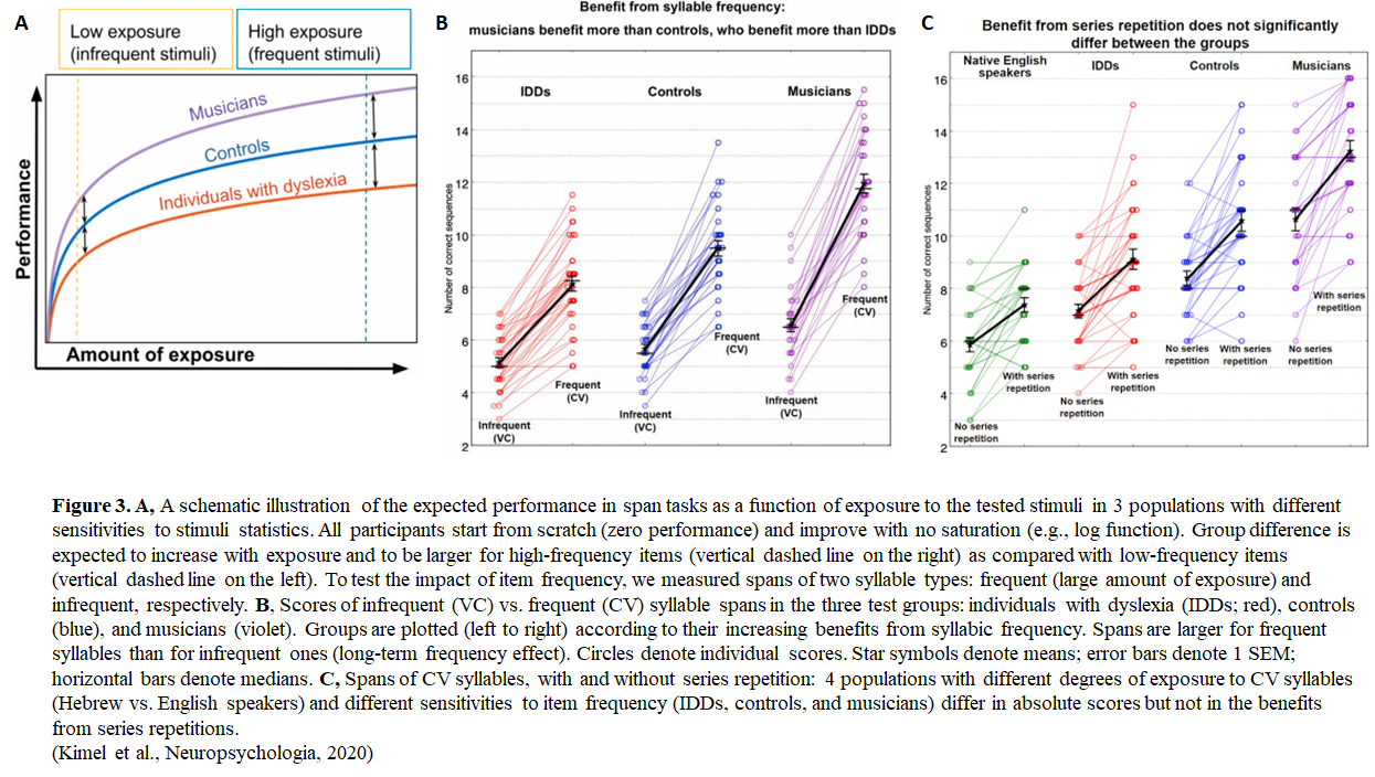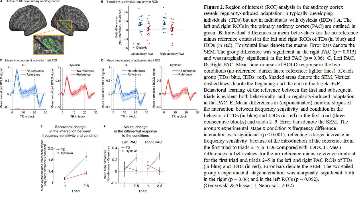 B. We conducted an imaging study (WP5) on dyslexia, aimed to measure whether difficulties in detecting non-consecutive regularities are manifested already in sensory cortices. We found that dyslexia is indeed characterized by difficulties in benefitting from structural regularities in simple pitch discrimination, and that these difficulties are manifested in no-adaptation to such regularities, in contrast to good readers’, in auditory cortices including the primary auditory cortex (Gertsovski & Ahissar, 2022).