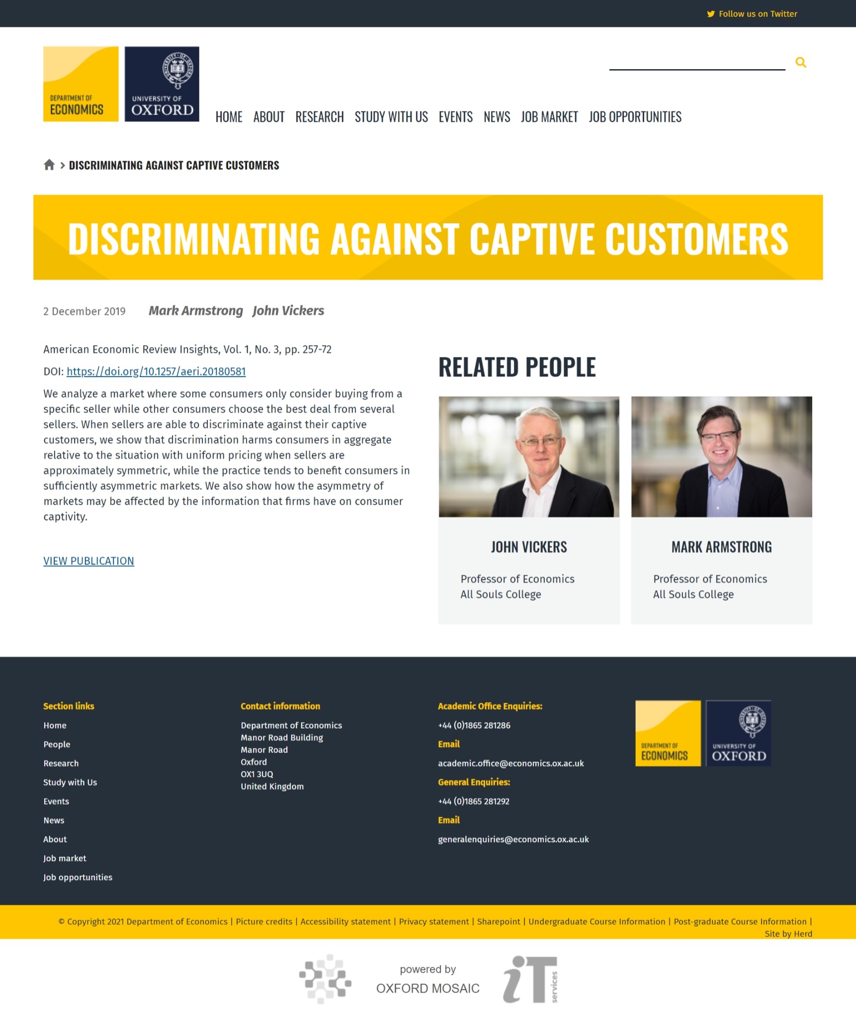 “Discriminating Against Captive Customers”, (2019), American Economic Review: Insights 1: 257-271 (with John Vickers). Abstract: We analyze a market where some consumers only consider buying from a specific seller while other consumers choose the best deal from several sellers. When sellers are able to discriminate against their captive customers, we show that discrimination harms consumers in aggregate relative to the situation with uniform pricing when sellers are approximately symmetric, while the practice tends to benefit consumers in sufficiently asymmetric markets. We also show how the asymmetry of markets may be affected by the information that firms have on consumer captivity.