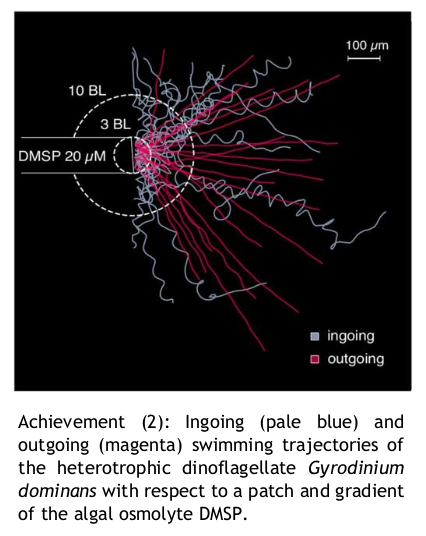 -We conducted chemotaxis experiments to investigate if protist grazing on phytoplankton is modulated by chemical signals, and if this oriented grazing facilitates the recovery of the prey population from physiological stress. Video cell tracking of predator swimming, cell counting of prey, and measurement of prey physiological stress level and recovery enabled to confirm that model herbivore protists are attracted by the algal osmolyte DMSP, this induces preferential grazing on sunlight-stressed algal cells, and subsequently accelerates prey population recovery from stress. [Güell-Bujons et al., ISME J. 18: wrae130 (2024); Güell-Bujons et al., in preparation]