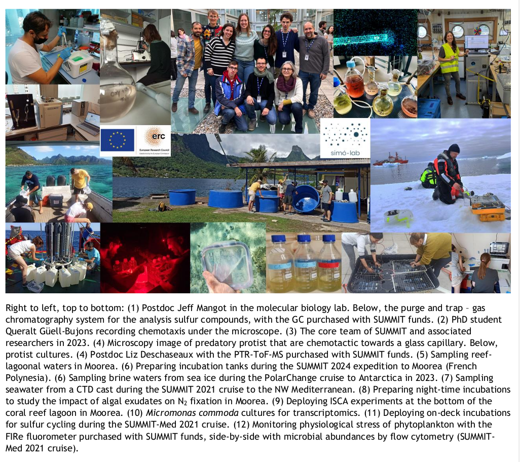 The SUMMIT project aimed to bridge microbial physiology, ecology and biogeochemistry to investigate the roles of demethylated sulfur compounds in shaping microbial interactions that are fundamental for the functioning of marine ecosystems. As part of (1) phytoplankton-bacteria interactions, SUMMIT has demonstrated that the main algal sulfur-containing osmolyte (named DMSP) is a strong chemoattractant for chemotactic bacteria, more so in synergy with other algal exudates; SUMMIT has also demonstrated that algal-derived compounds trigger the fixation atmospheric nitrogen by heterotrophic bacteria; SUMMIT has shown how the variability of sulfur cycling among phytoplankton and bacteria can be approached through the transcription of the relevant genes. With respect to (2) phytoplankton-phytoplankton interactions, SUMMIT has confirmed that phytoplankton are not only the main producers of the osmolyte DMSP but also consumers, has identified the protein that allows the uptake of external DMSP, and has shown that uptake of external DMSP helps to overcome energy limitation to growth. Finally, by studying (3) phytoplankton-herbivore interactions, SUMMIT has demonstrated there is chemically-oriented selective grazing by predatory protists using algal-released DMSP as the chemical cue, and this selective grazing enhances the recovery of phytoplankton prey populations from physiological stress. Finally, SUMMIT has developed a numerical model that does a better job than previous models to describe sulfur cycling throughout algal blooms. SUMMIT has also developed improved diagnostic models for the distribution and emission of volatile sulfur across the global ocean, present and future.