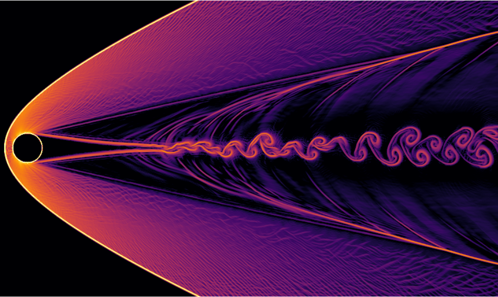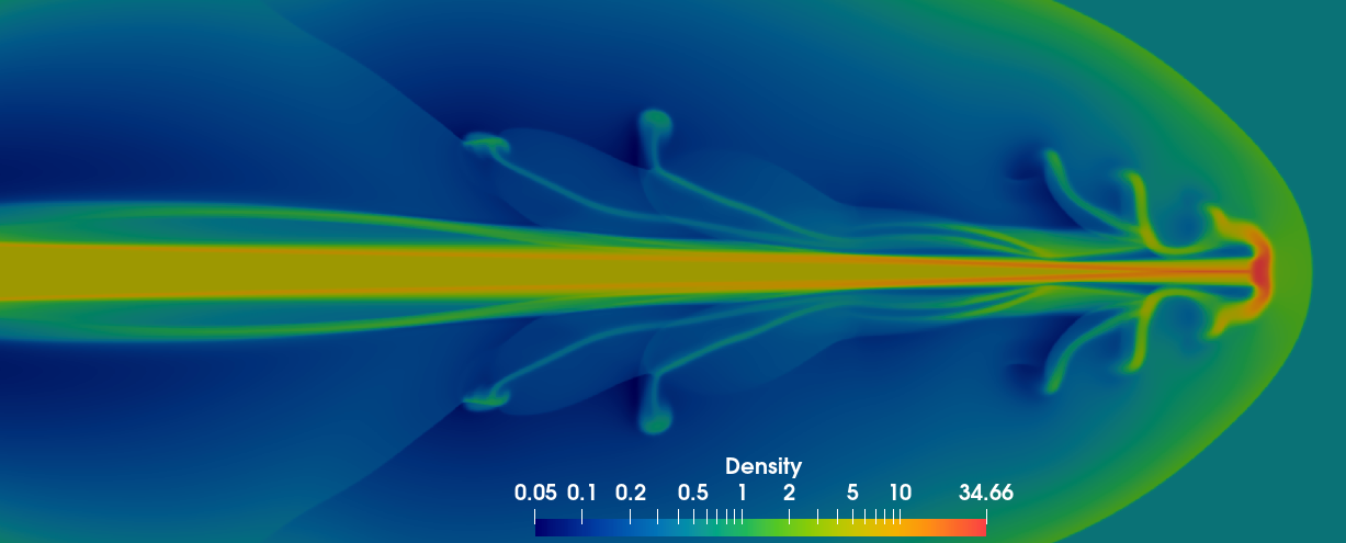 With this, simulations of hypersonic flows, such as astrophysical jet at Mach number 80 (see figure for illustration) were achieved. Extensive testing of performance was conducted on a number of benchmark problems including Richtmyer-Meshkov instability of shock wave, near-vacuum flows, shock diffraction at a corner and others.
